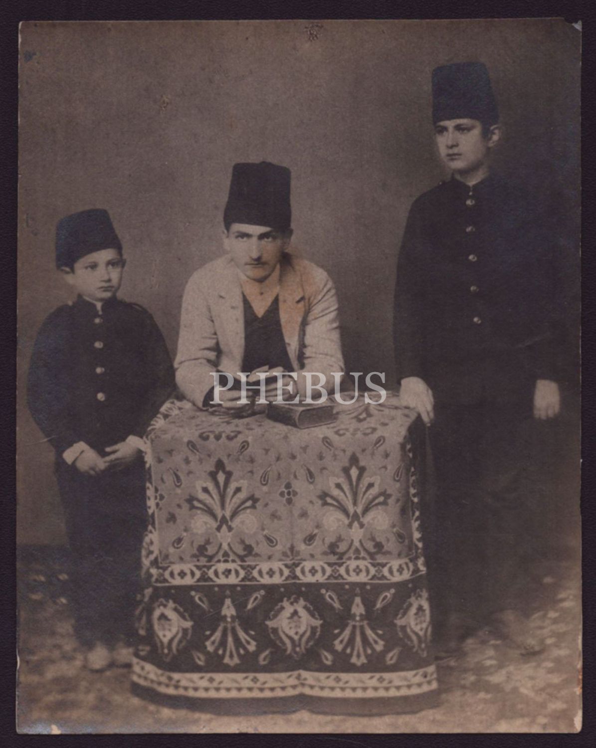 Elinde kitabı ve yanı başında duran gençlerle poz veren beyefendinin stüdyo hatıra fotoğrafı, 11x14 cm...