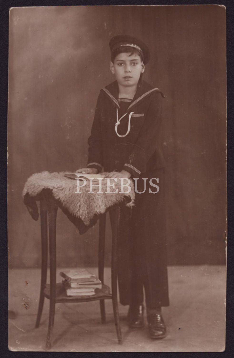 Elinde kitabı ve denizci üniformasıyla poz veren gencin stüdyo hatıra fotoğrafı, Photo L´Aigle (İstanbul), 9x14 cm...