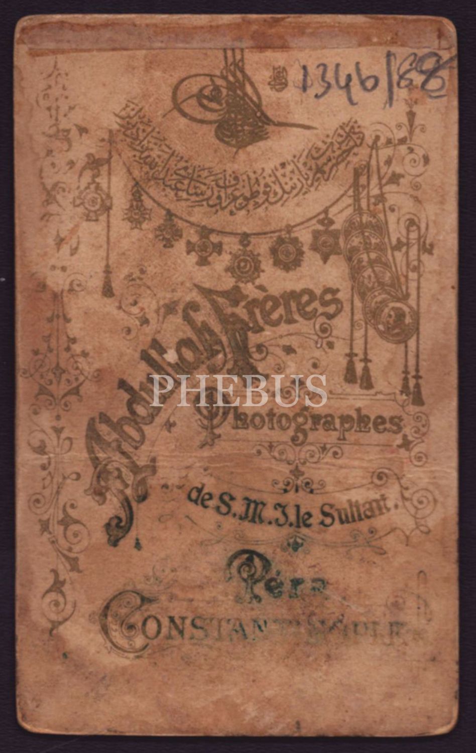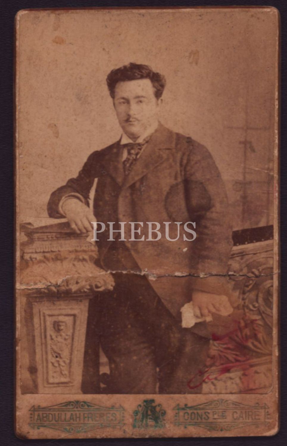 Kitaplara yaslanmış şık giyimli beyefendinin stüdyo hatıra fotoğrafı, Abdullah Freres Fotoğrafhanesi (Constantinople), 7x11 cm...