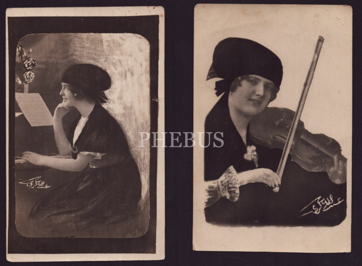 Musiki aletleri başında Türk kadınları, 9x14 cm boyutunda iki adet kartpostal, 9x14 cm...