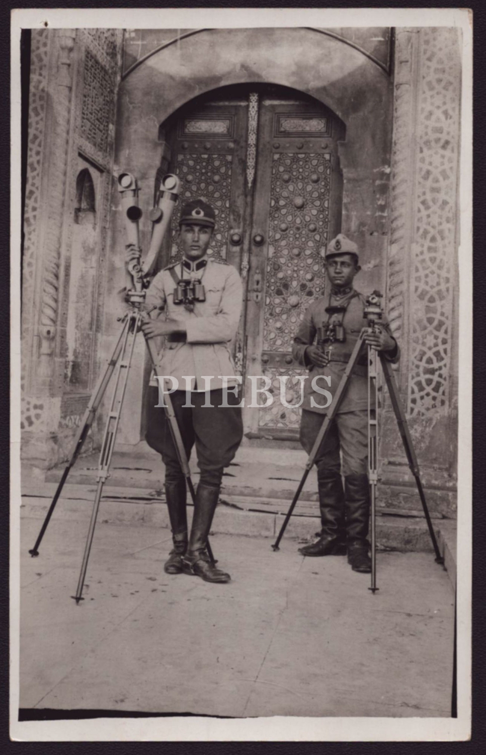 Sahra dürbünü ve teodolitle poz veren Osmanlı askerlerinin fotoğrafı, 9x14 cm...