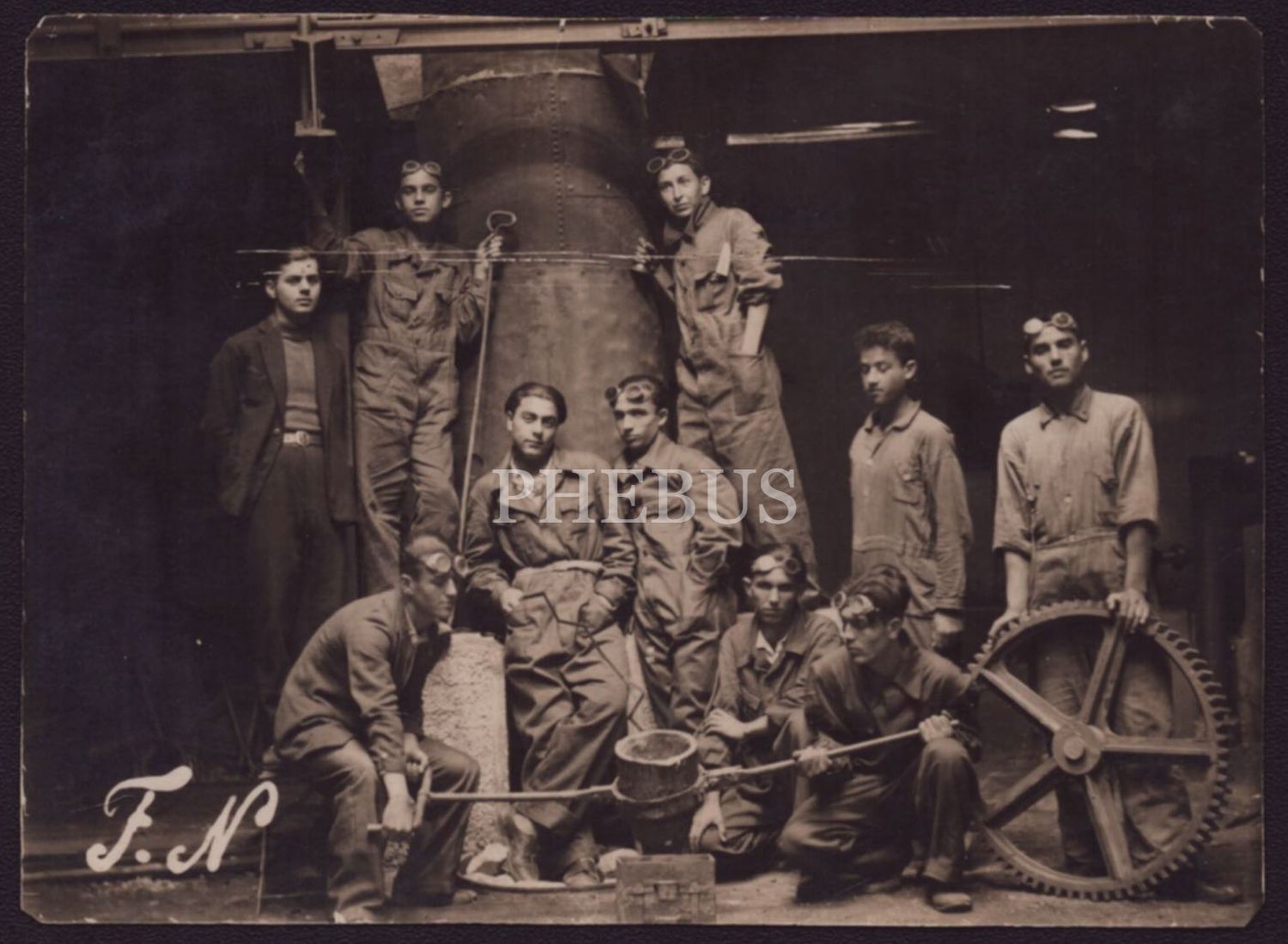 Demir döküm atölyesi işçilerinin hatıra fotoğrafı, 11x9 cm...