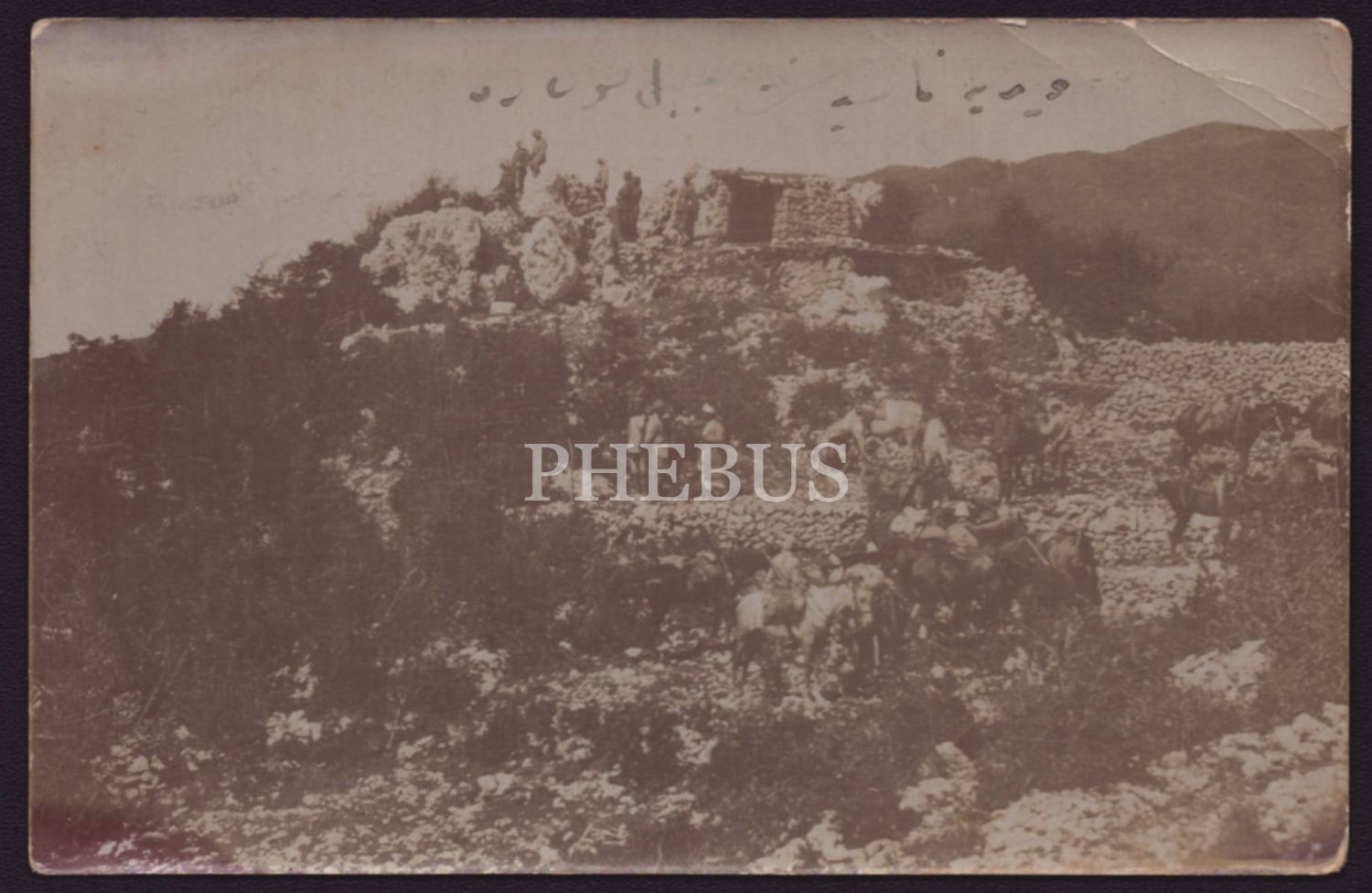 Osmanlı ordusu Cebel bölüğünün kayalık bir araziye tırmanışı esnasında alınmış fotoğrafı, K. Missirlian (Halep), 14x9 cm...