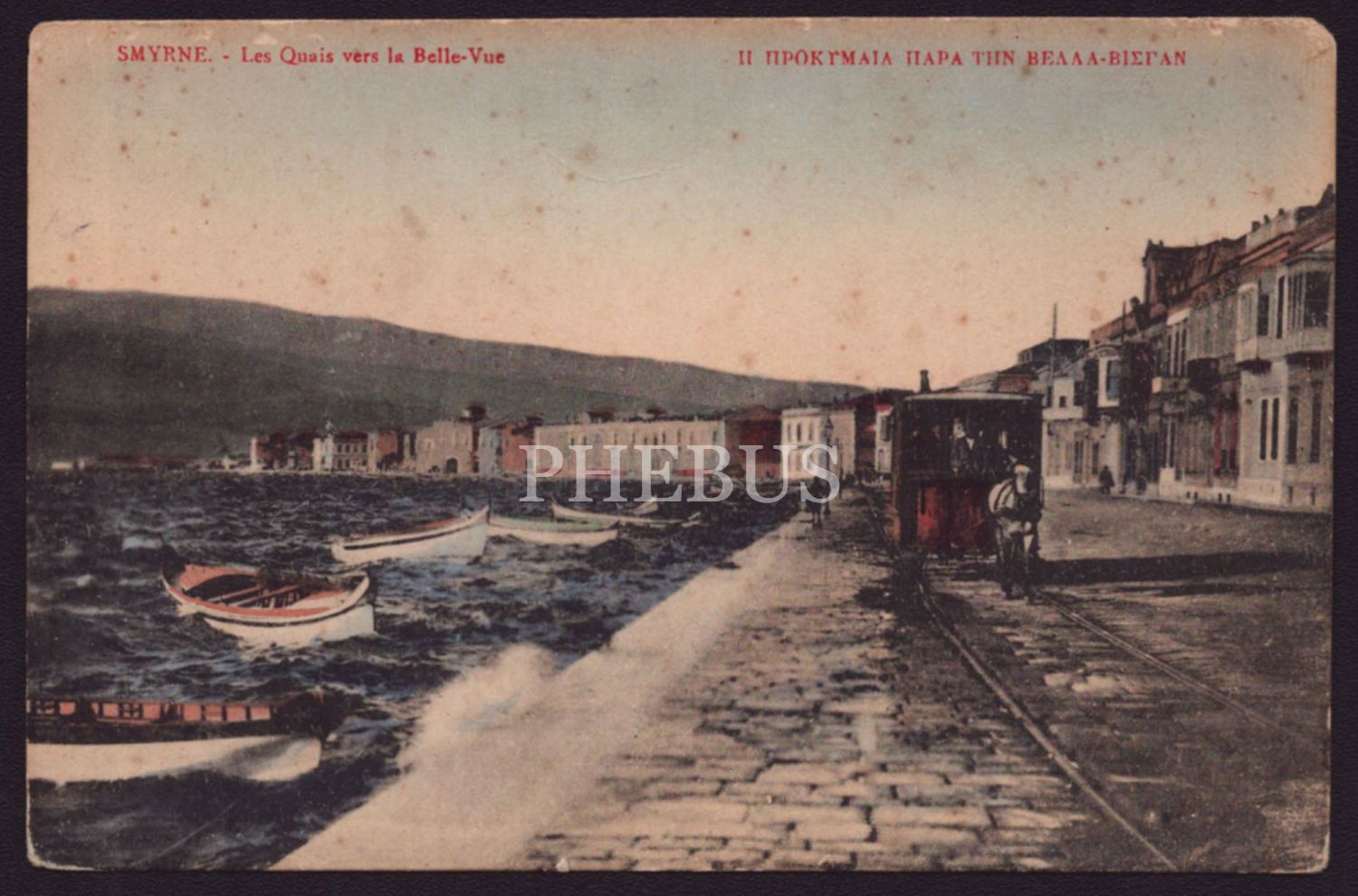 İzmir Kordon´da bir atlı fayton, "Smyrne - Les Quais vers la Belle-Vue", ed.: Decipris, (Smyrna), 14x9 cm...