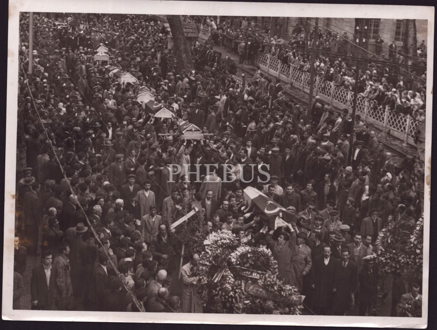 İzmit Körfezi´nde çıkan fırtına nedeniyle batan Üsküdar vapurunda hayatını kaybeden yolcuların cenaze töreninden alınmış fotoğraf, 24x18 cm...