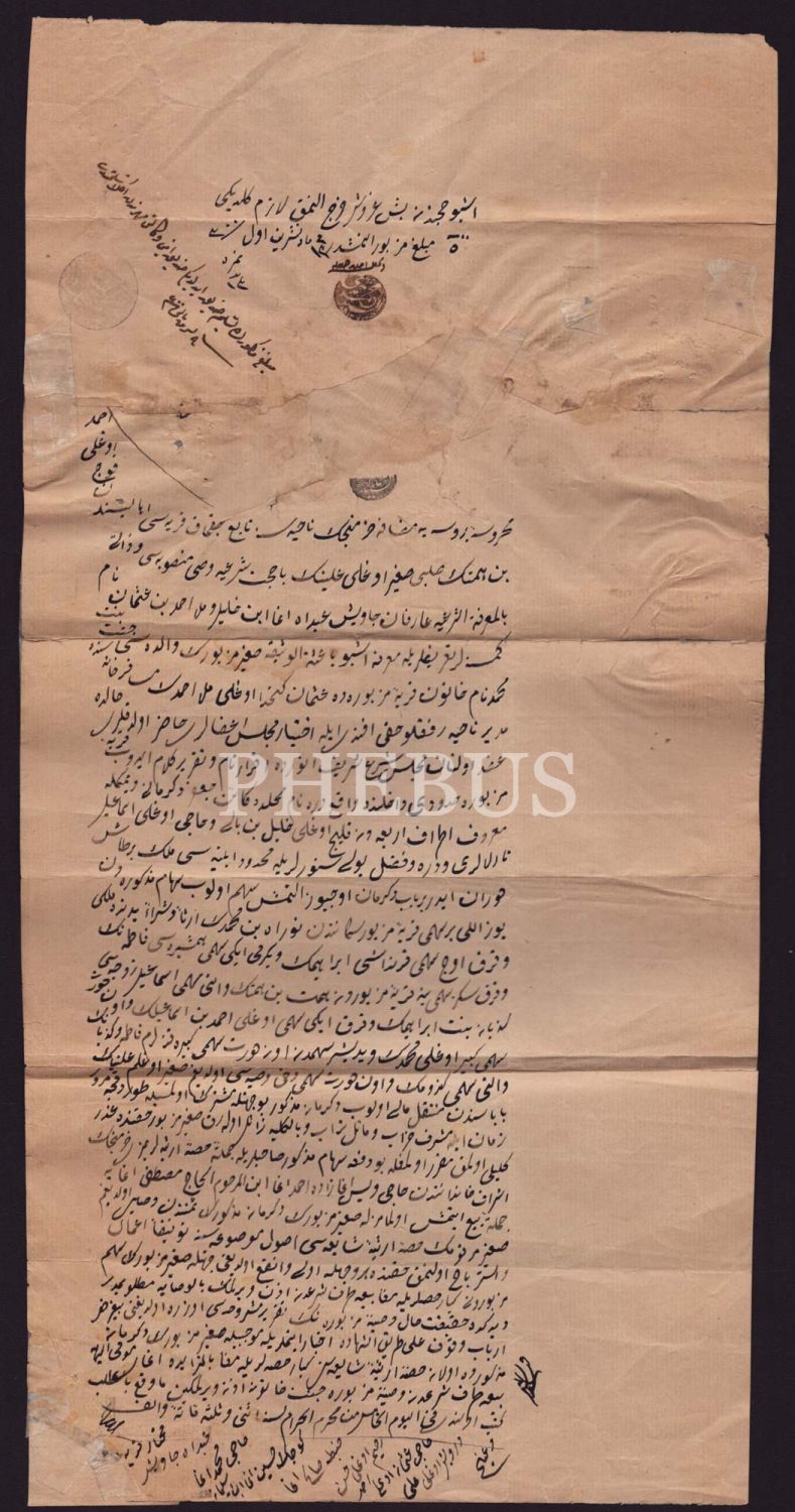 Bursa´nın Harmancık ilçesinde ikamet ederken vefat eden Koçoğlu Ahmet Bey´in mirasının taksim edildiği evrak, 9 Teşrinisani 1300, 21x40 cm...