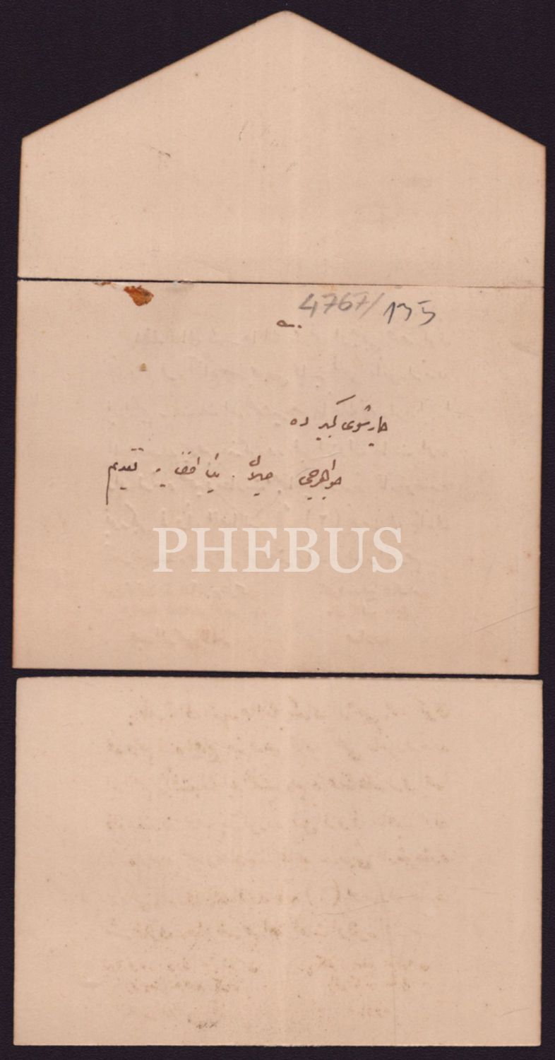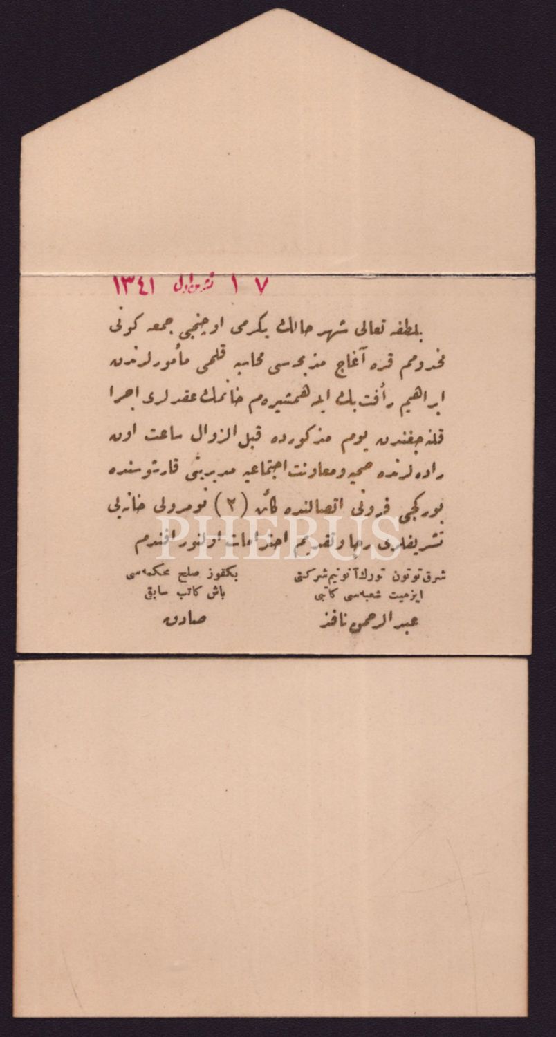 Kapalıçarşı´da kuyumcu Celal Bey´e gönderilen, Karaağaç muhasebe kalemi memurlarından İbrahim Refet Bey ve müstakbel eşininin düğün davetiyesi, 18 Teşrinievvel 1341, 10x13 cm...
