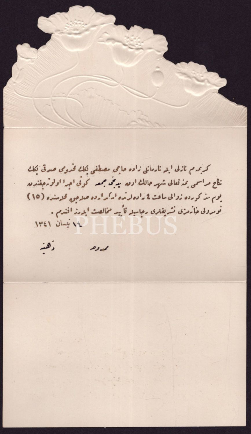 İstiklal Caddesi´nin meşhur yapılarından Narmanlı Han´ın sahibi Narmanlızade Mustafa Efendi´nin oğlu Sıddık Narmanlı´nın düğün davetiyesi, 14 Nisan 1341, 22x13 cm...