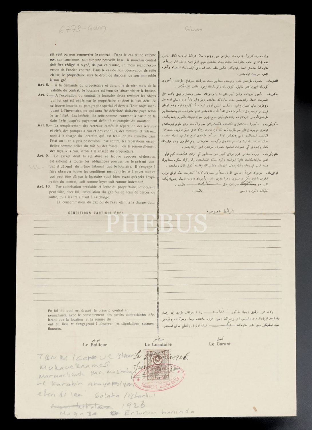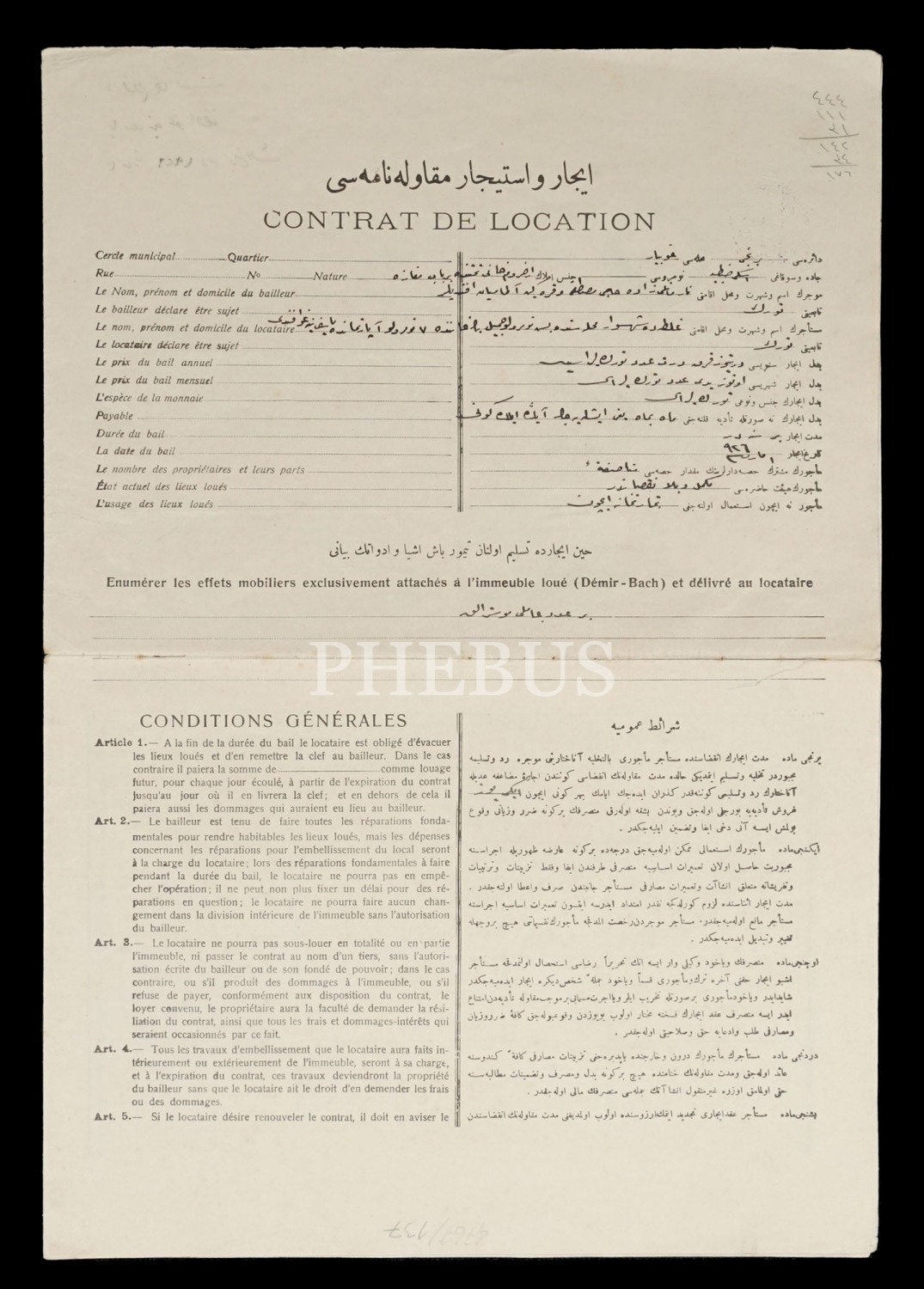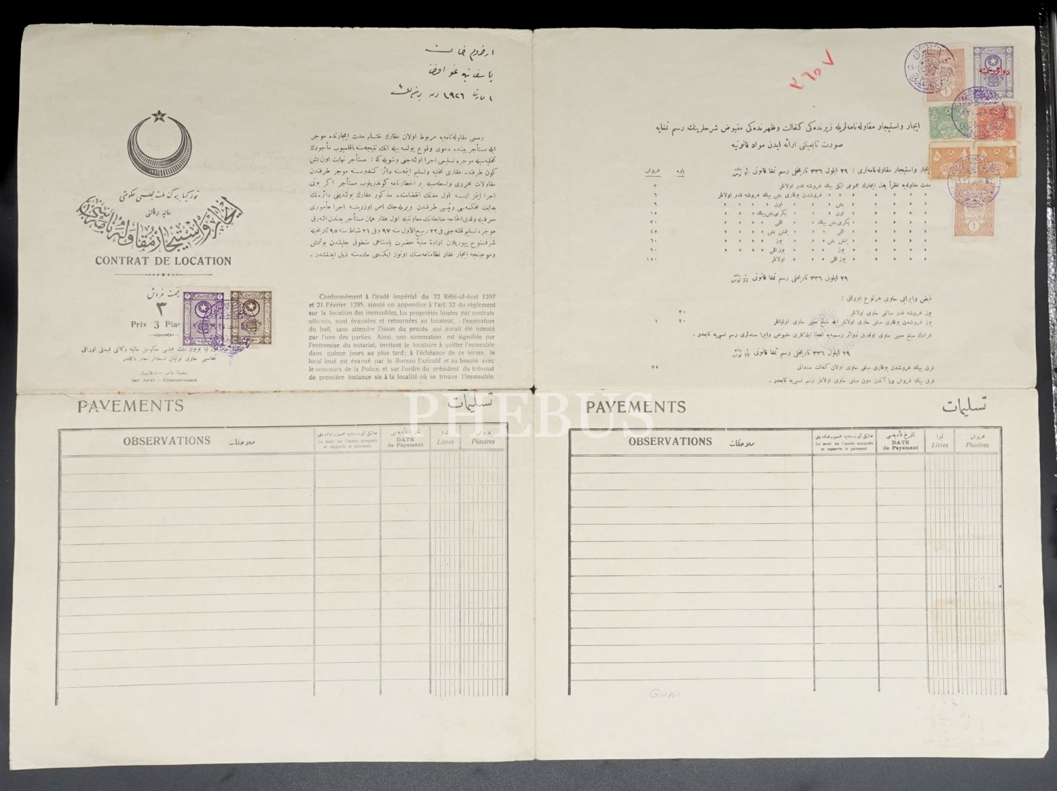 İstiklal Caddesi´nin meşhur yapılarından Narmanlı Han´ın sahibi Narmanlızade Mustafa Efendi ve ortağı Karekin Almamiyan´ın Erzurum Han´da bir mağazayı kiraya verdiklerine dair 1 Mart 1926 tarihli kira kontratı, 4 sayfa, 29x41 cm...