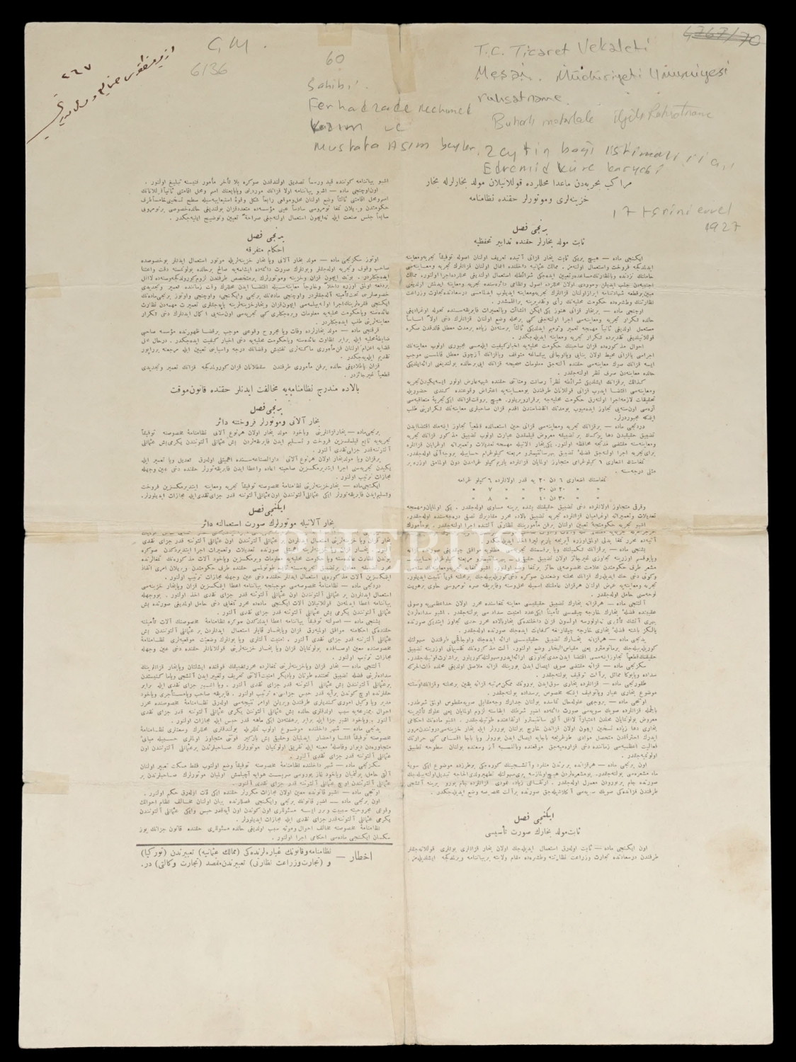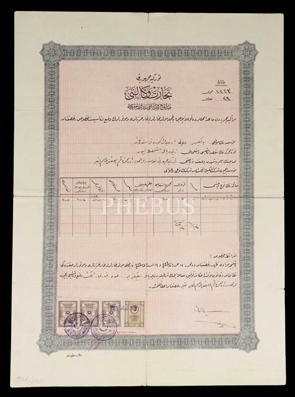 Balıkesir´in Edremit ilçesinde zeytin yağı imalatı için Türkiye Cumhuriyeti Ticaret Vekaleti Sanayi ve Mesai Müdüriyeti Umumiyesi tarafından verilen ruhsatname, 32x43 cm...
