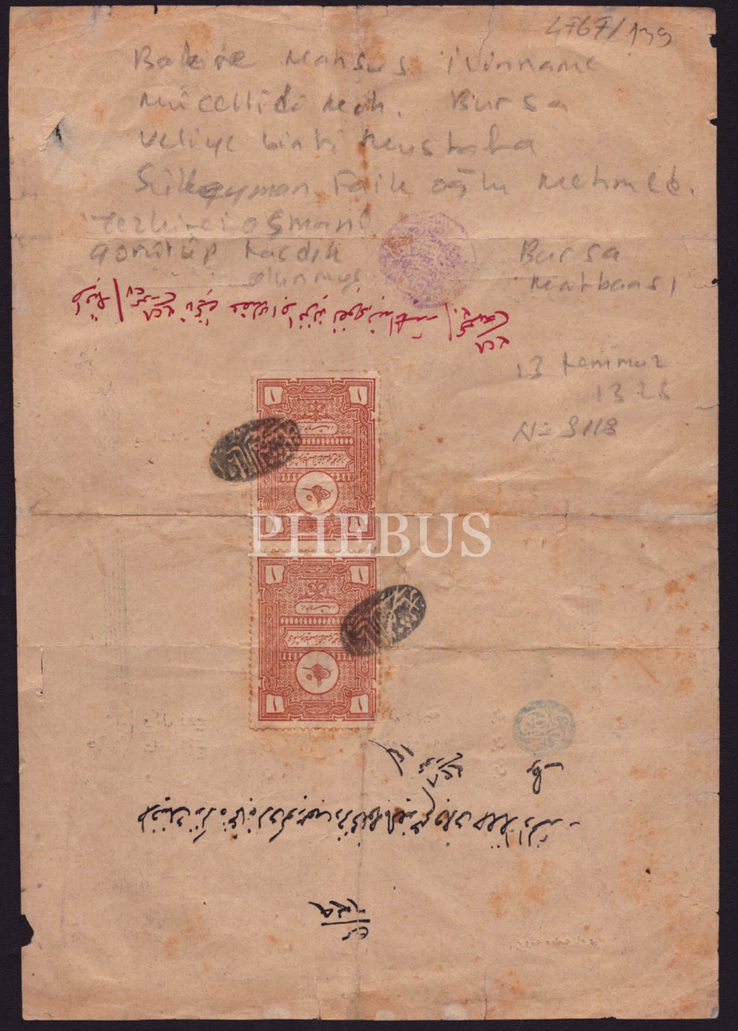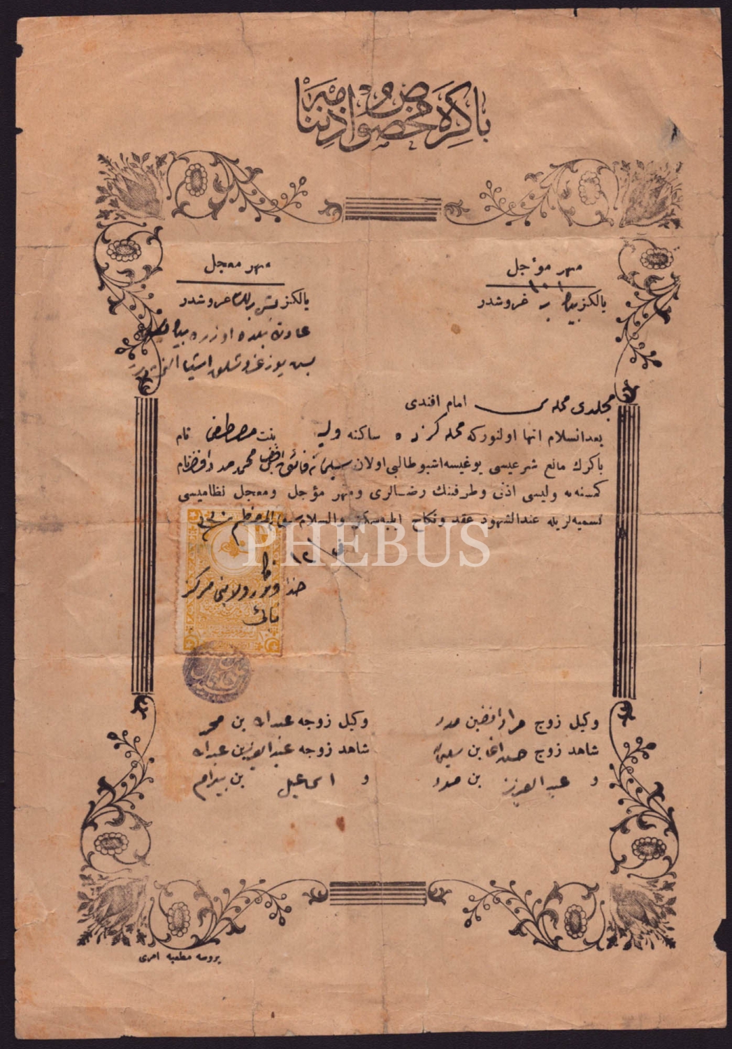 Veliye binti Mustafa Hanım ile Süleyman Faik bin Mehmed Efendi adına düzenlenmiş 1330 tarihli bakire izinnamesi (evlenme belgesi), Bursa Matbaası, 18x25 cm...