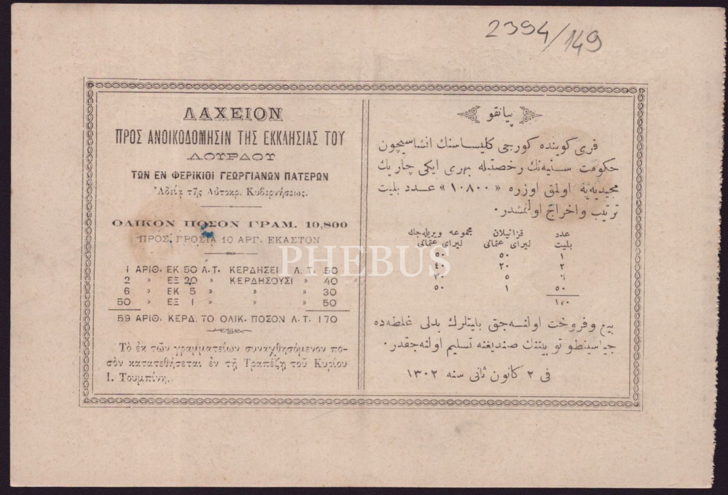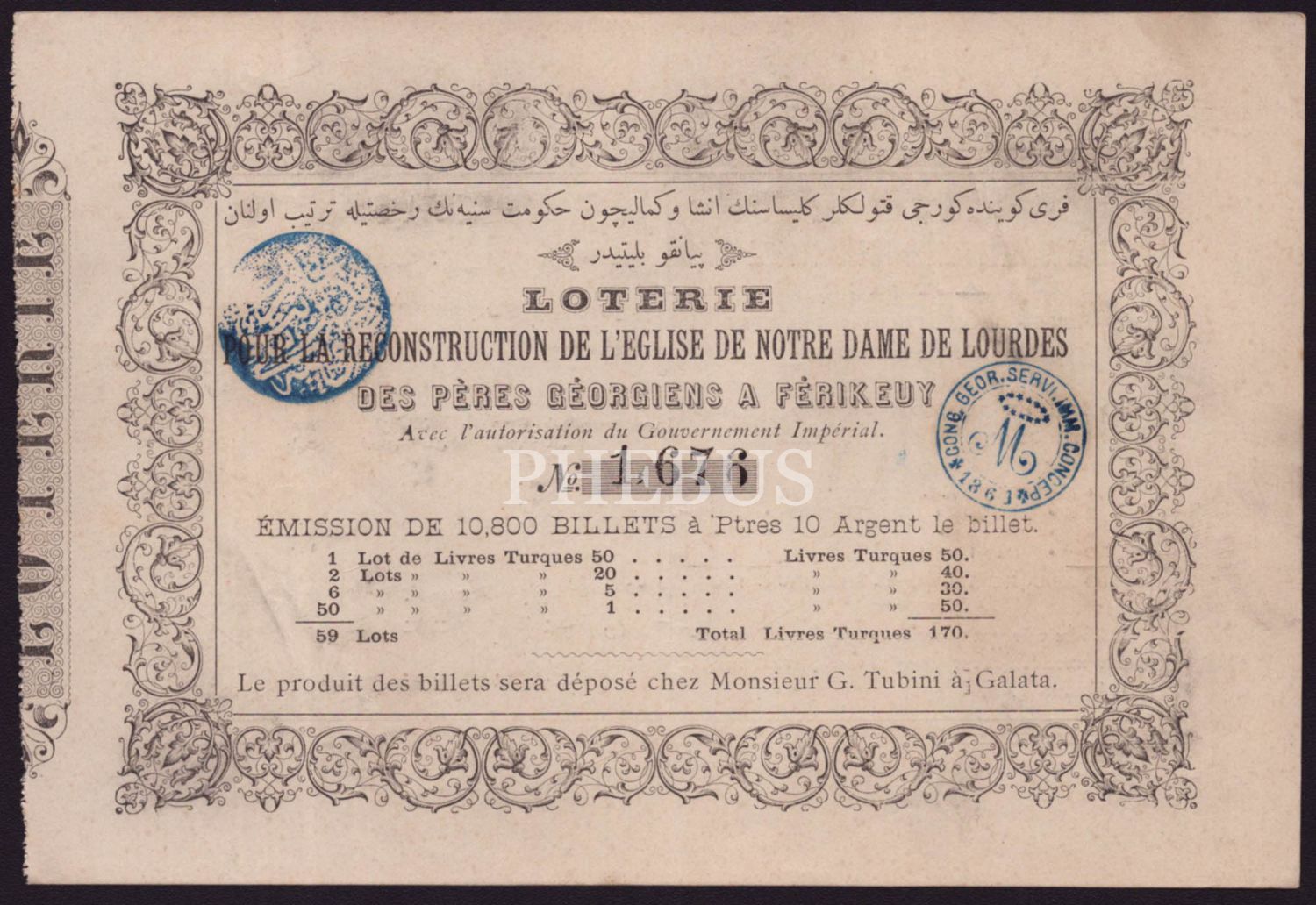 "Feriköyünde Gürcü Katolikler Kilisesi´nin inşaa ve kemali için hükümet-i seniyyenin ruhsatıyla tertip olunan piyango biletidir"