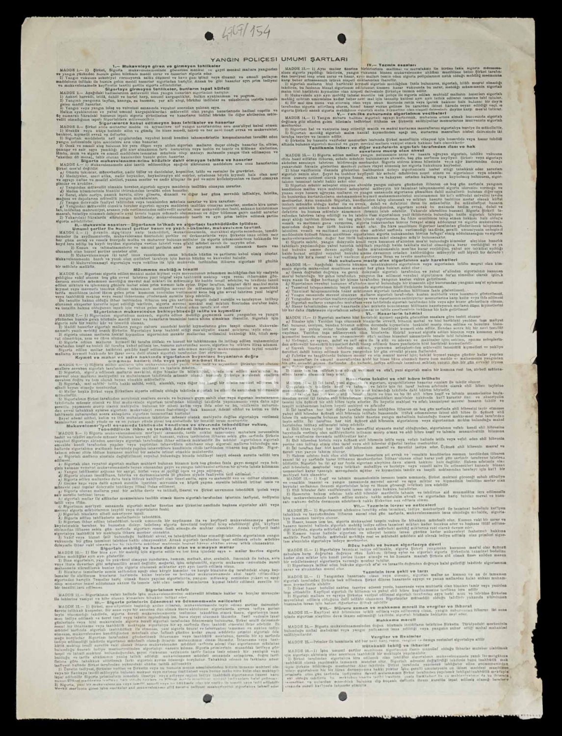 İstanbul Umum Sigorta Acentesi tarafından meşhur kolonya üreticisi Eyüp Sabri Tuncer´in Ankara´da Sakarya Apartma´nın altında bulunan kolonya imalathanesi için düzenlenmiş yangın sigorta poliçesi, 29 Nisan 1947, 31x42 cm...