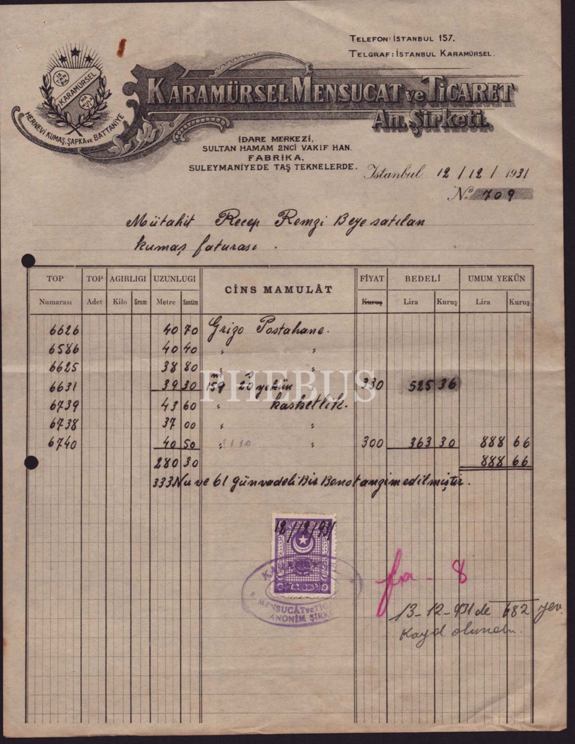 Kumaş, şapka ve battaniye imalathanesi "Karamürsel Mensucat (dokuma) ve Ticaret Anonim Şirketi" antetli fatura, 12 Aralık 1931, 22x29 cm...