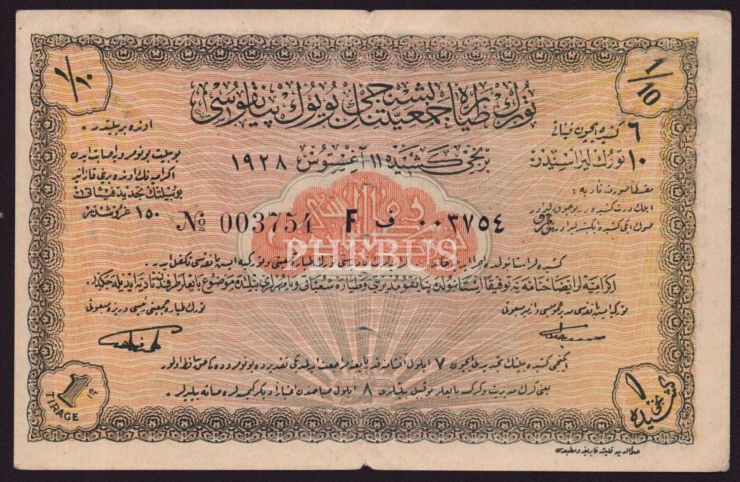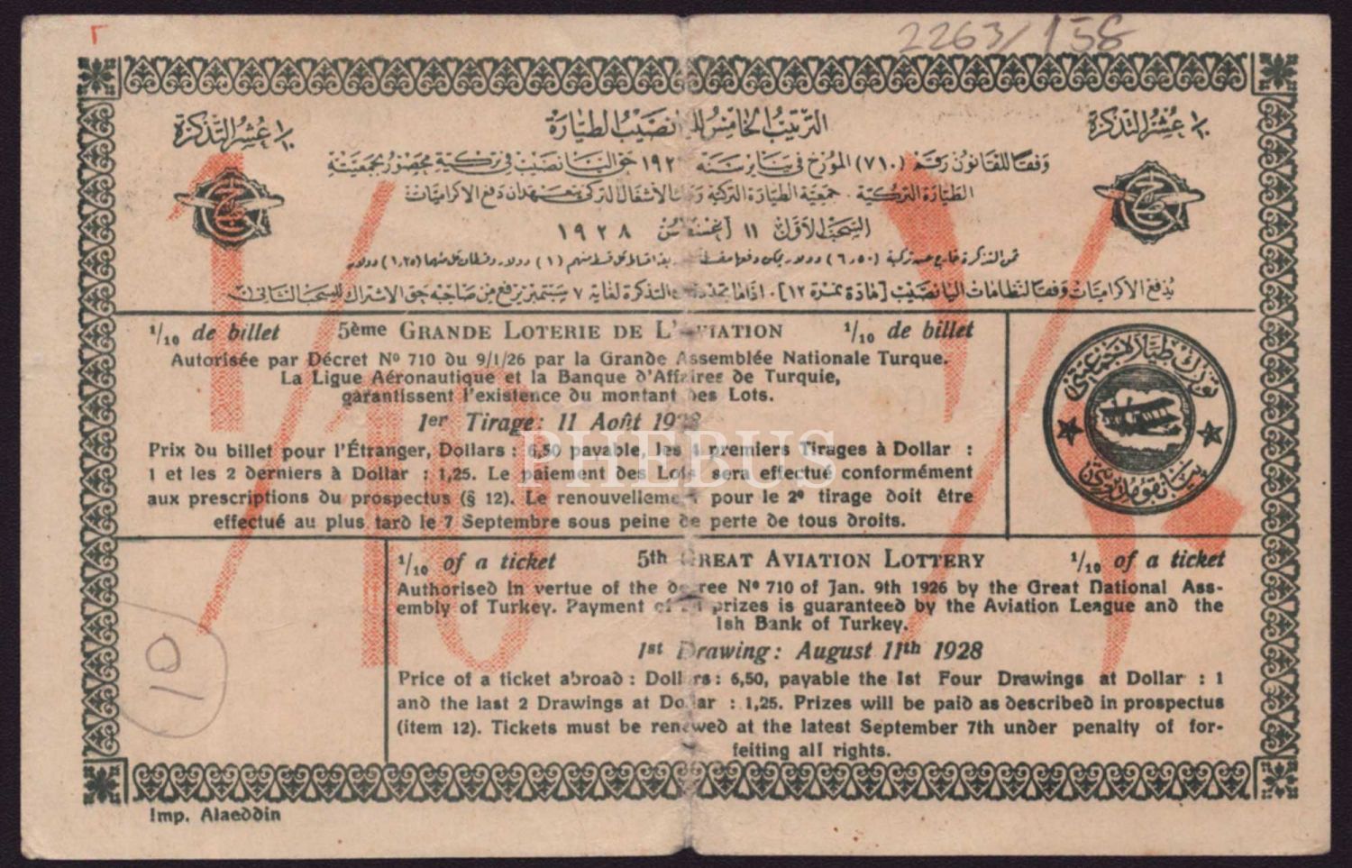 Türk Teyyare Cemiyeti´nin tertip ettiği Beşinci Büyük Tayyare Piyangosu´nun bileti, 11 Ağustos 1929, 17x11 cm...