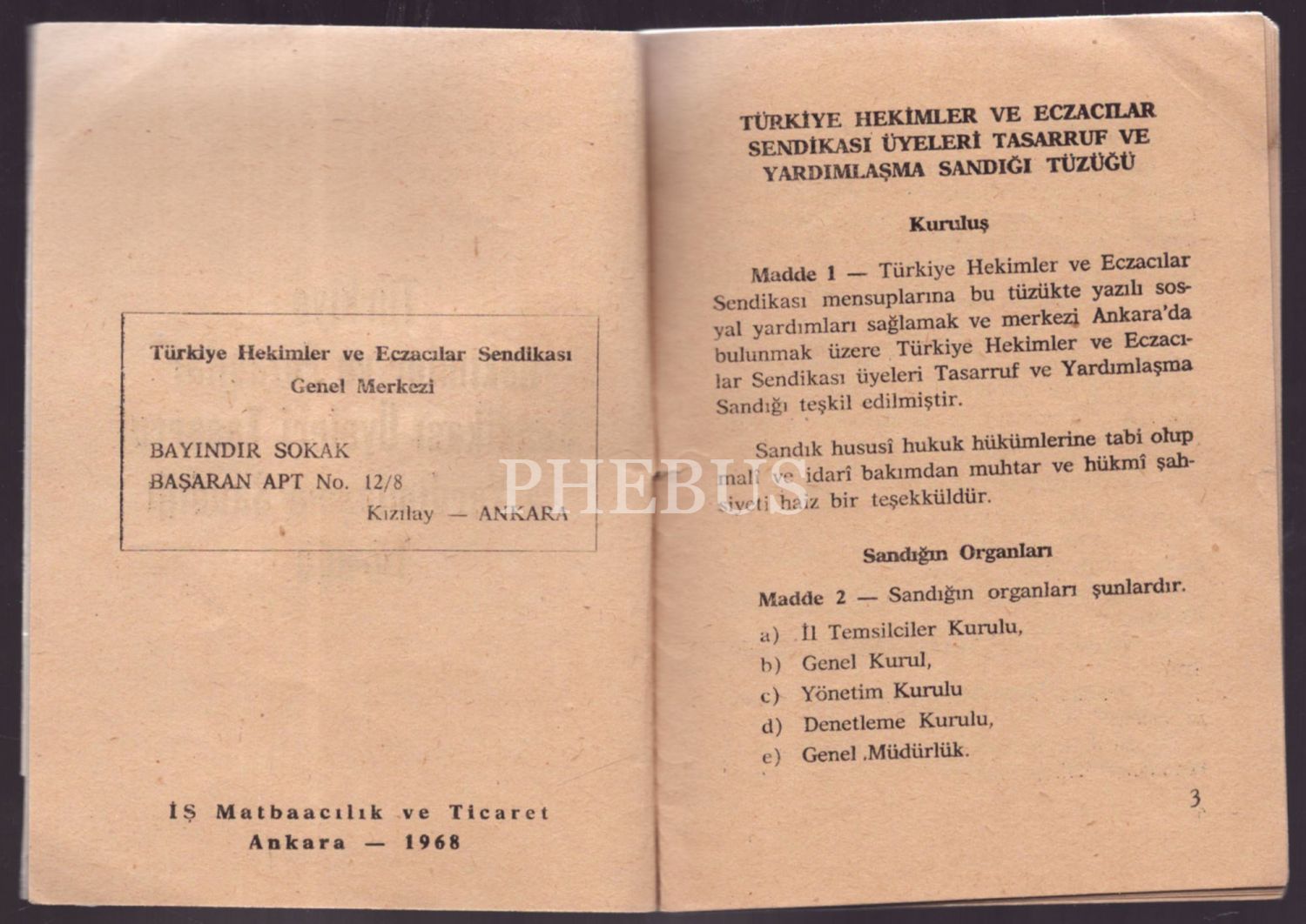 TÜRKİYE HEKİMLER VE ECZACILAR SENDİKASI TASARRUF VE YARDIMLAŞMA SANDIĞI ANA TÜZÜĞÜ, 1968, İş Matbaacılık ve Ticaret, 31 sayfa, 10x13 cm...