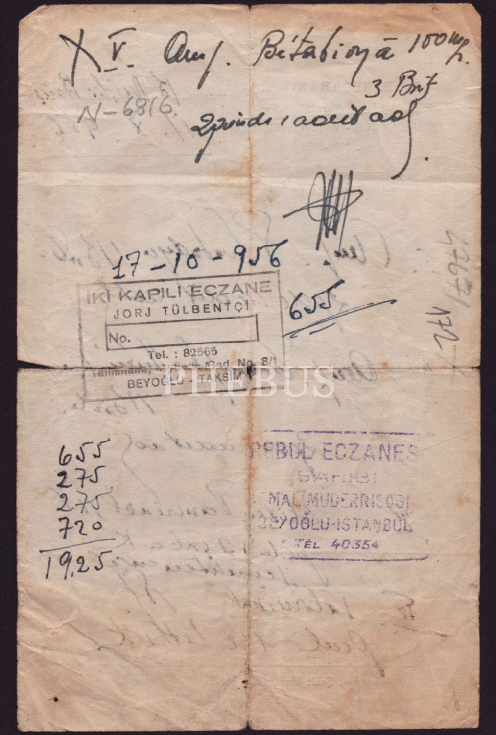 Reçetenin arka yüzünde, İki Kapılı Eczane (Jorj Tülbentçi)´nin kaşesi yer almaktadır.