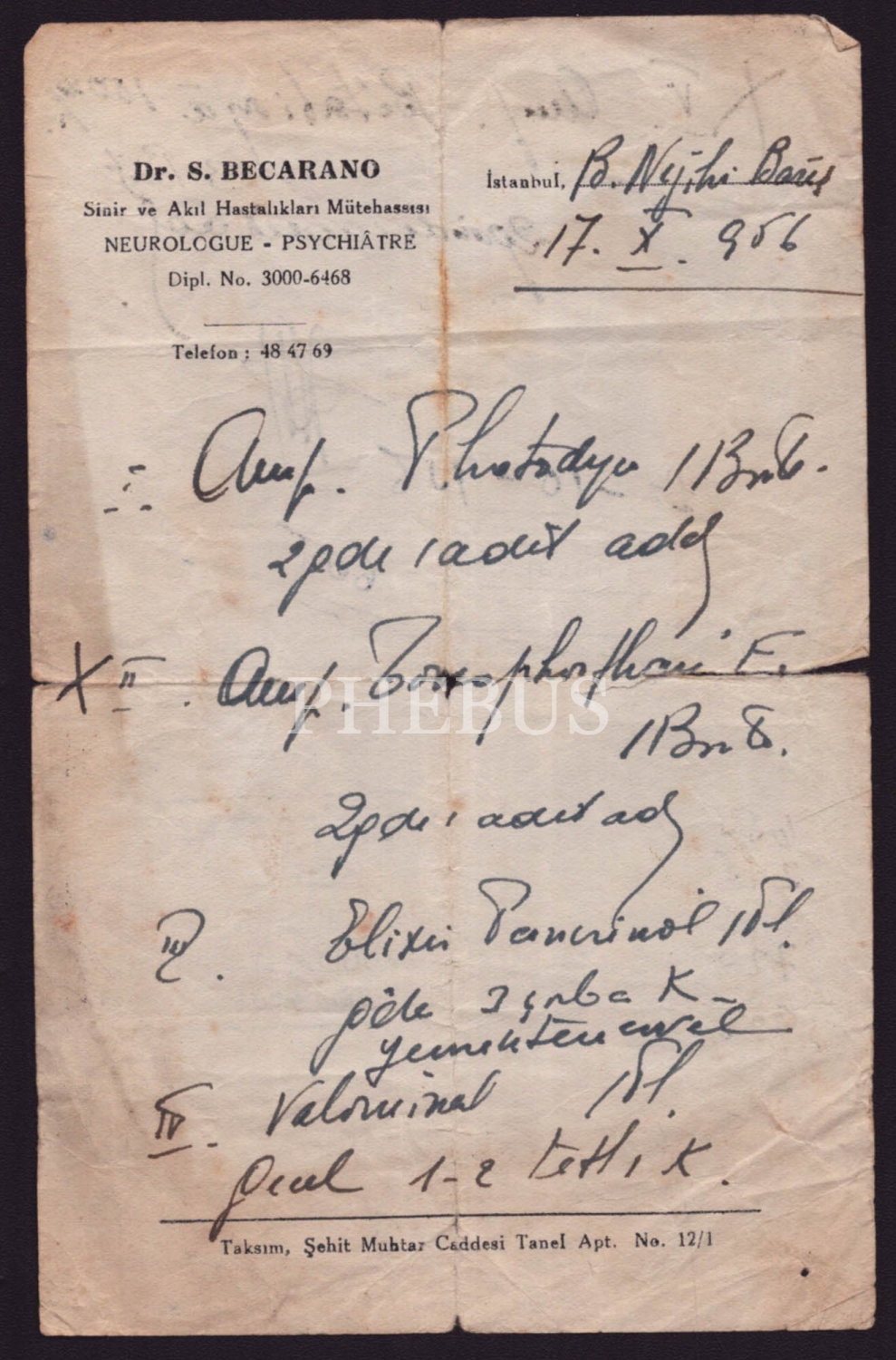 Sinir ve Akıl Hastalıkları Mütehassısı Dr. S. Becarano antetli reçete, 17 Ekim 1956, 13x20 cm...