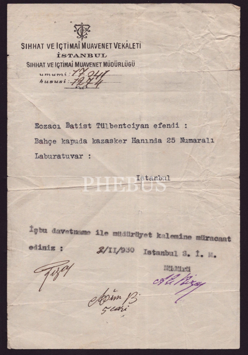 Sıhhat ve İçtimai Muavenet Vekaleti İstanbul Müdürlüğü antetli Eczacı Batist Tülbentciyan adına düzenlenmiş davetname, 3 Şubat 1930, 14x20 cm...