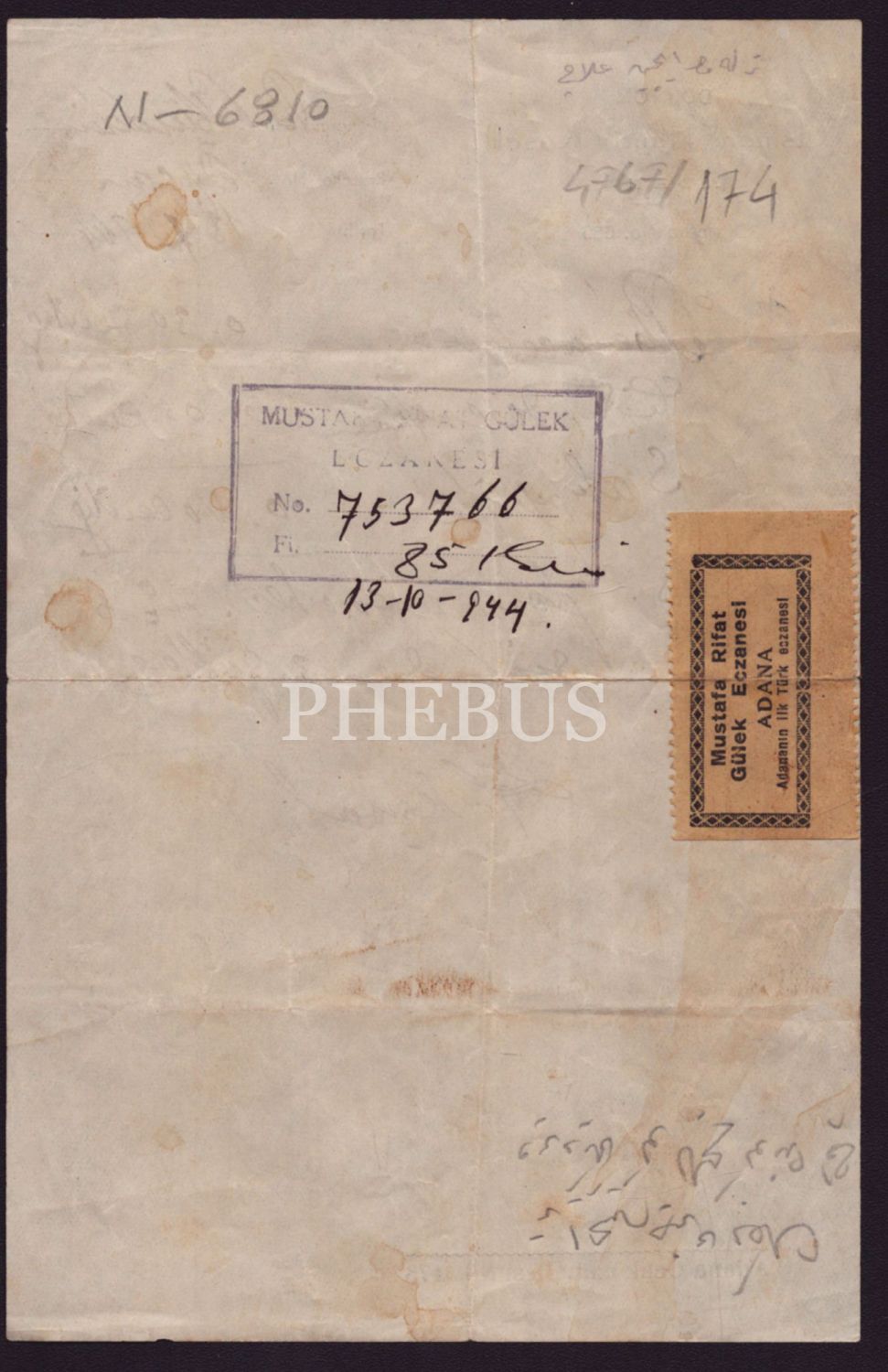 Reçetinin arka yüzünde, "Adana´nın ilk Türk eczanesi" Mustafa Rifat Gülek Eczanesi´nin kaşesi ve etiketi yer almaktadır.