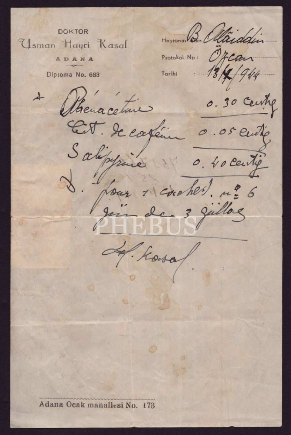 Doktor Usman Hayri Kasal (Adana) antetli reçete, 13 Ekim 1944, 13x20 cm...