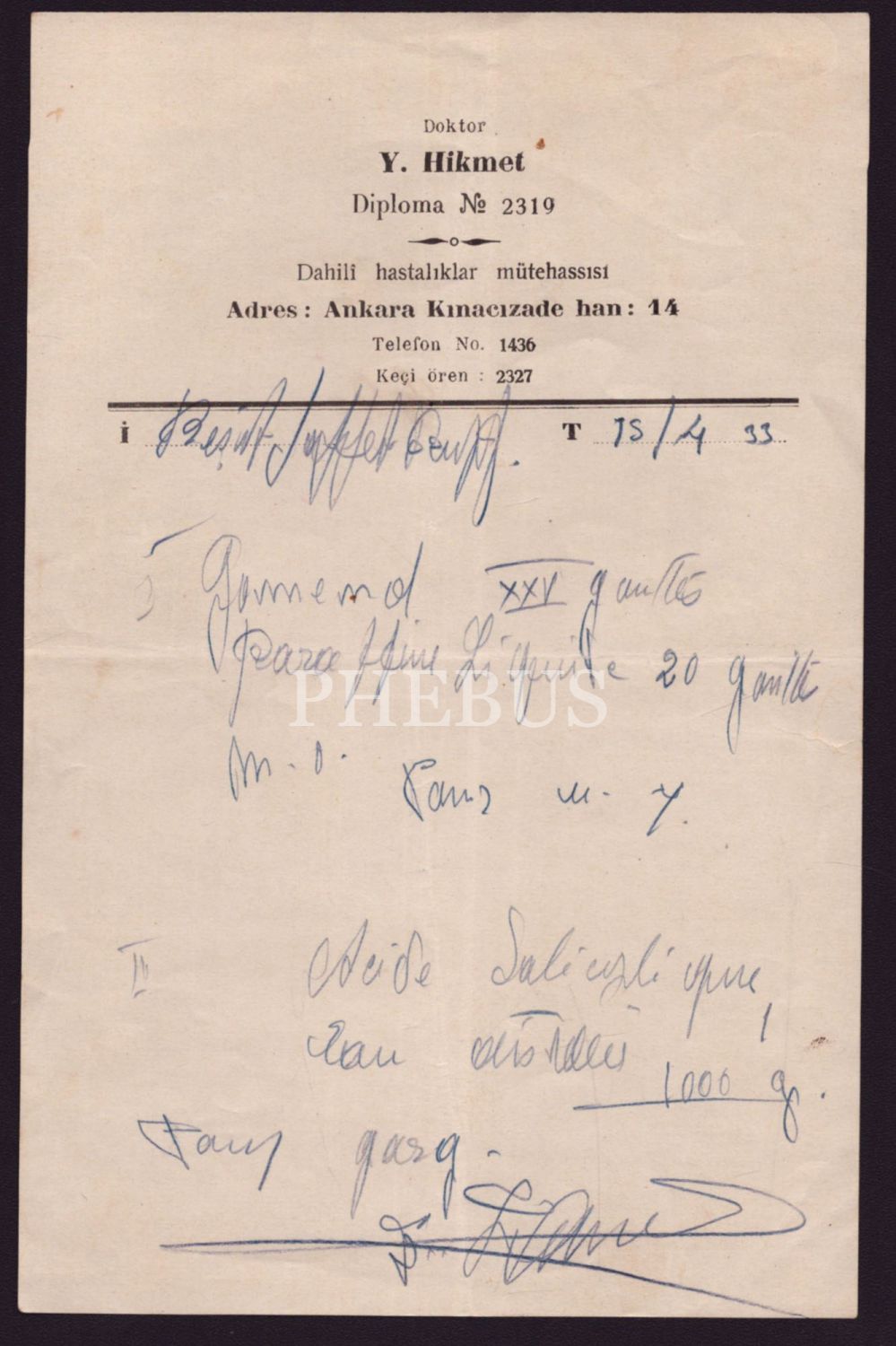 Doktor Y. Hikmet (Ankara) antetli reçete, 14x21 cm...