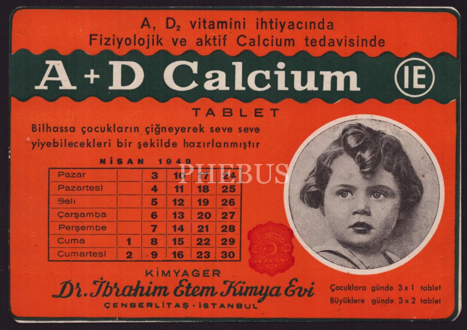 Kimyager Dr. İbrahim Etem Kimya Evi ve A+D Calcium Tablet reklamlı kartonet, 18x12 cm...