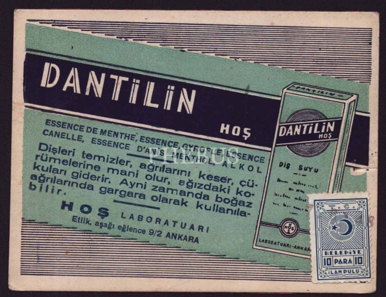 "Dantilin Hoş Diş Suyu" reklam kartoneti, Hoş Laboratuarı (Ankara), 14x11 cm...