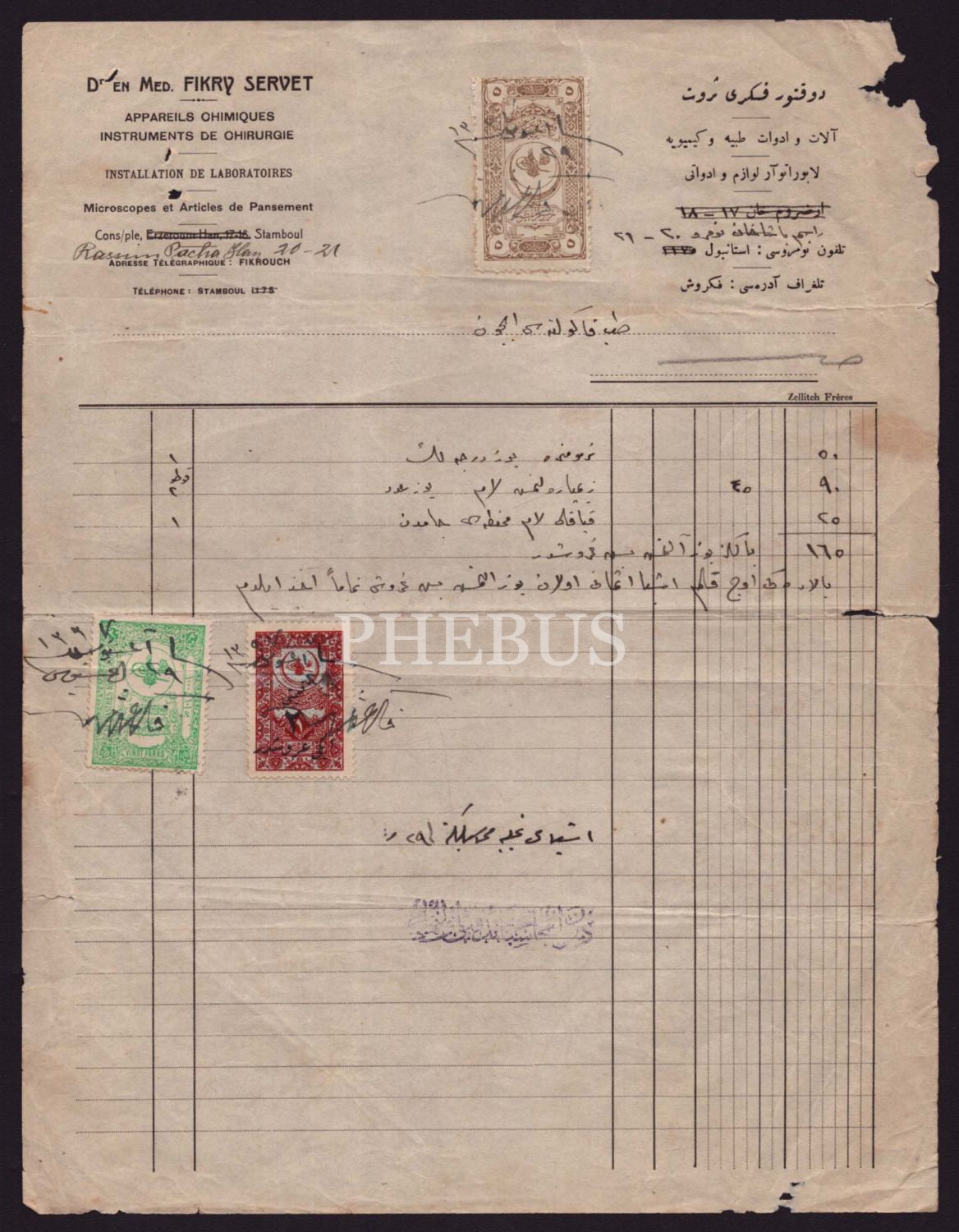 Tıp ve kimya için gerekli alet ve edavat tüccarı Doktor Fikri Servet (İstanbul, Rasim Paşa Hanı) antetli fatura, 22x28 cm...
