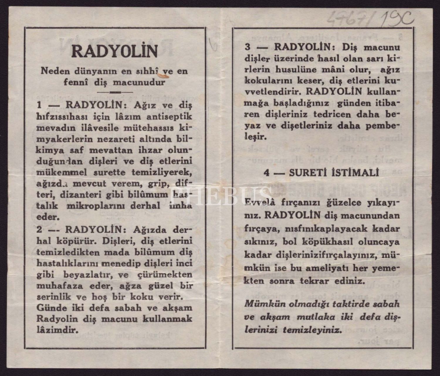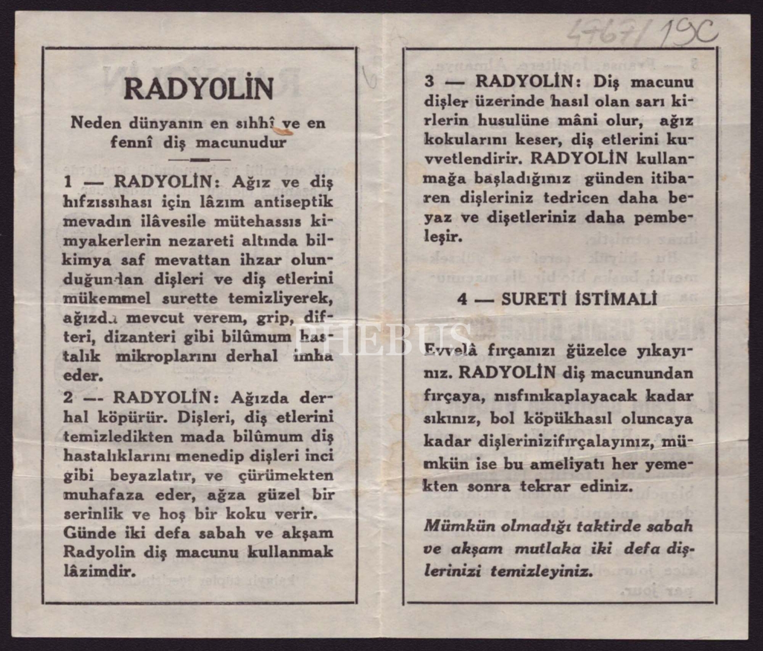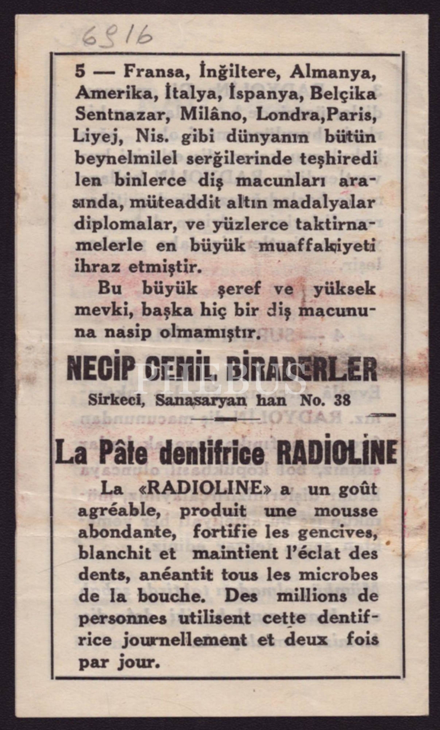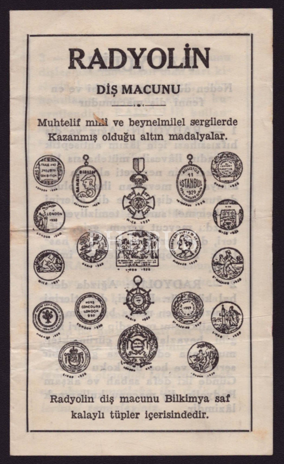 "Radyolin Diş Macunu (Necip Cemil Biraderler)" reklam kitapçığı, 4 sayfa, 9x15 cm...