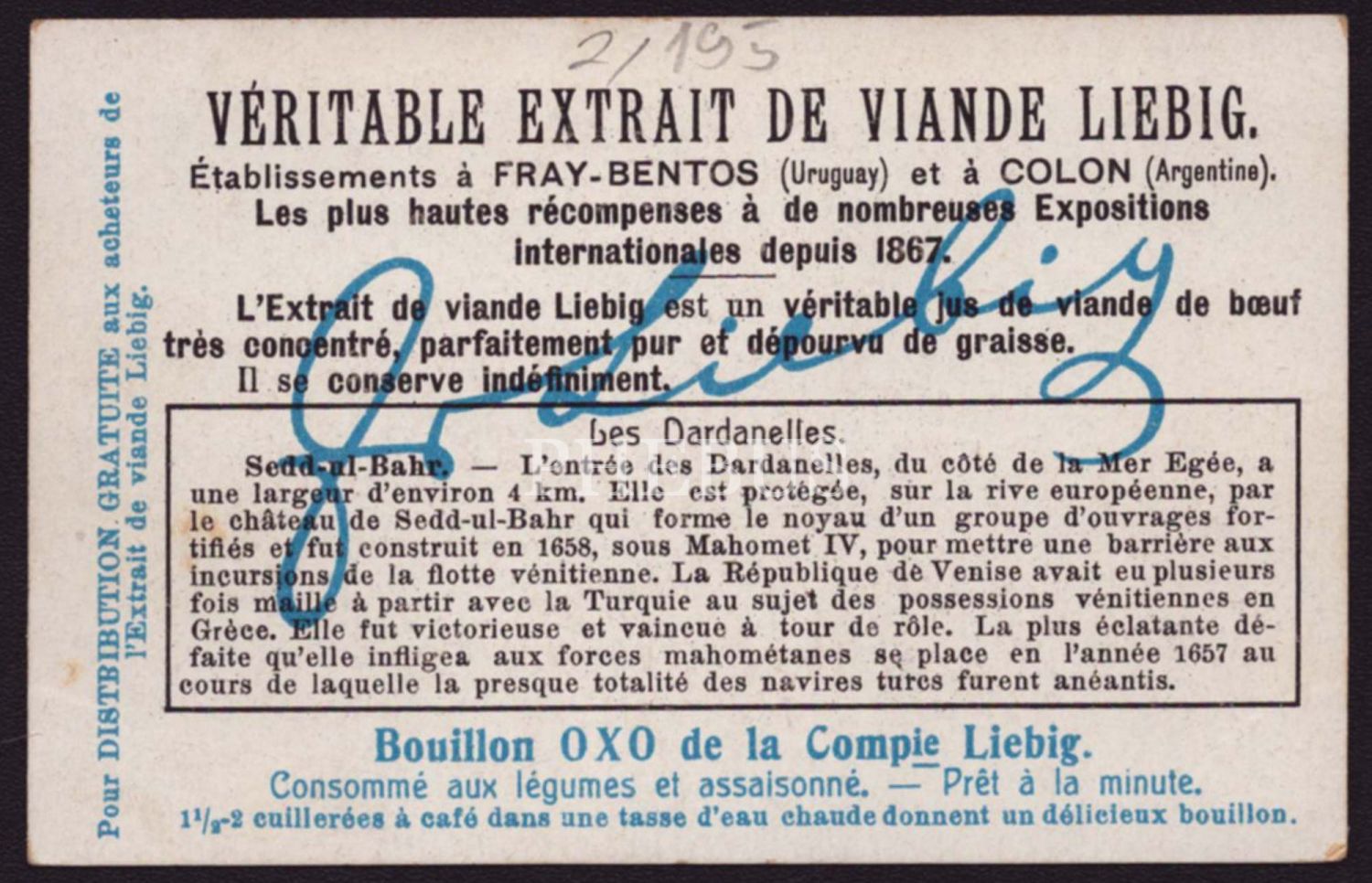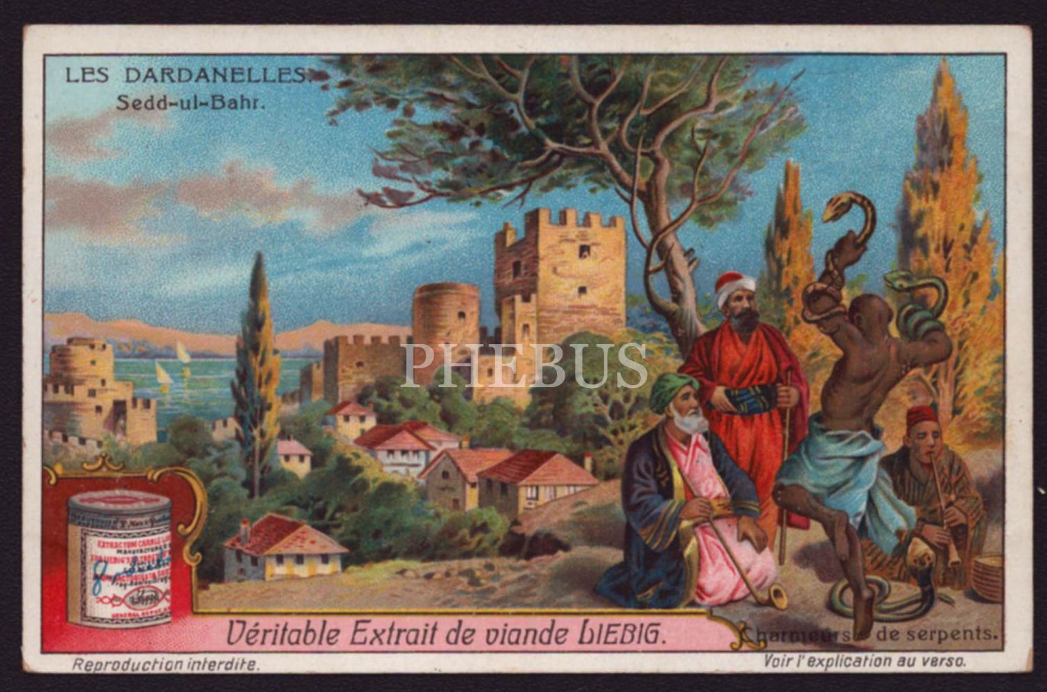 "Compagnie Liebig" markasının Osmanlı pazarı için hazırladığı, Seddülbahir Kalesi önünde yılan oynatıcıları görselli ticaret kartı, 11x7 cm...