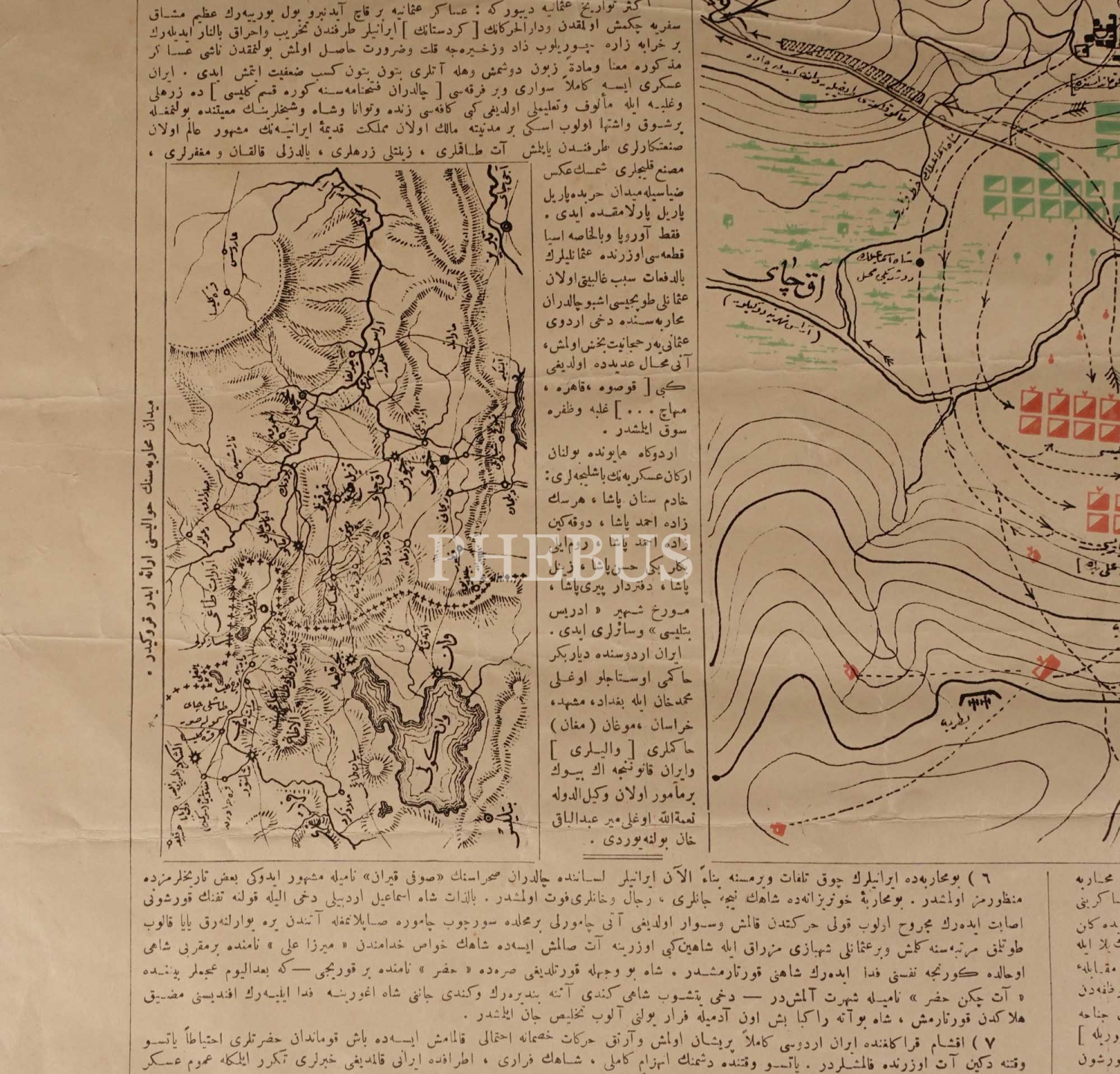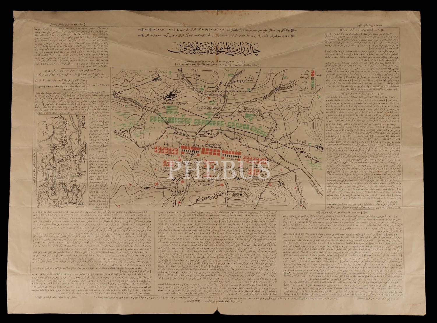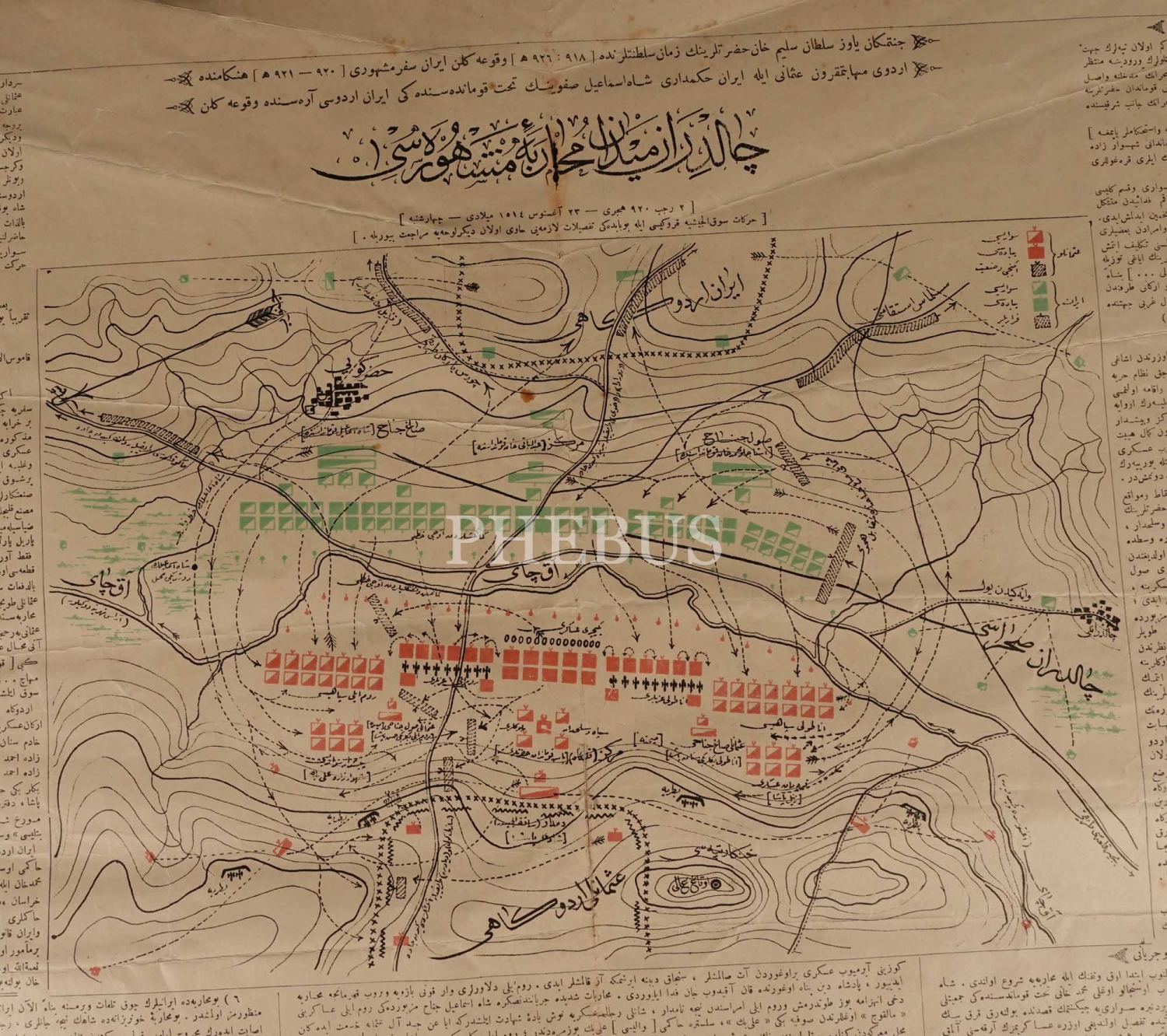 Askeri Müze´nin Kurucusu Ferik Ahmed Muhtar Paşa´nın Muharebât-ı Meşhûre-i Osmaniye Albümü (Osmanlı´nın Meşhur Savaşları Albümü) ´nden çıkma, "Çaldıran Meydan Muharebe-i Meşhuresi" başlıklı açıklamalı savaş krokisi, 1321, Mekteb-i Harbiye-i Şahane Matbaası, 68x51 cm...