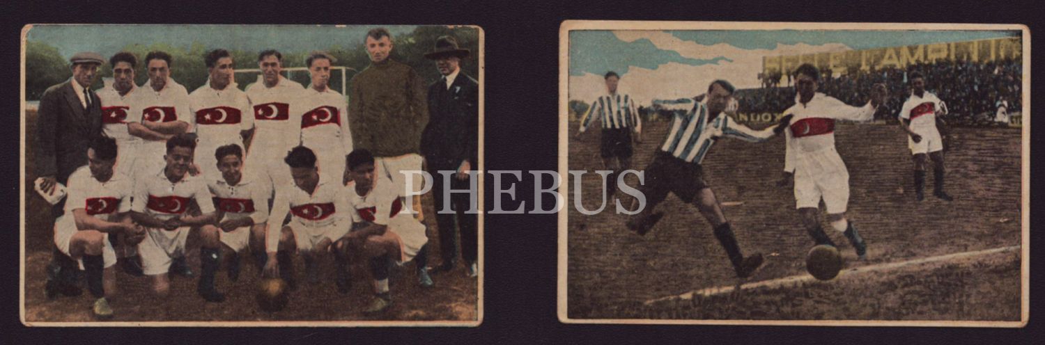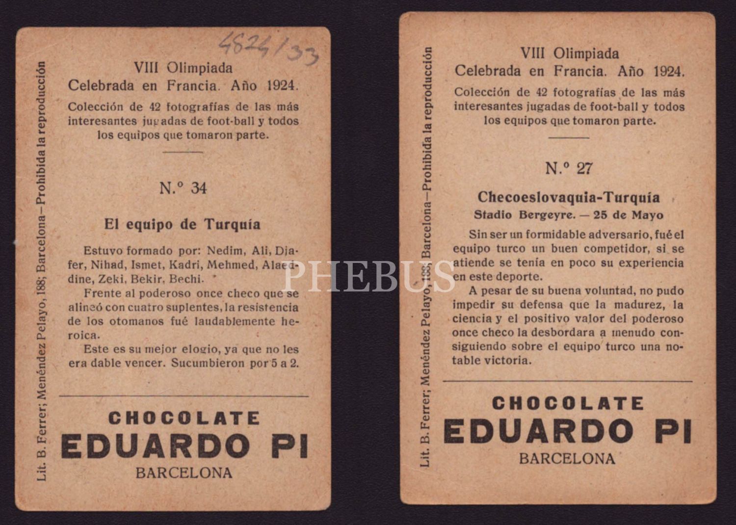 Fransa´nın Paris şehrinde düzenlenen 1924 Yaz Olimpiyatları´nda Çekoslovakya ile Türkiye arasında oynanan karşılaşmadan bir enstantanenin ve Türk Milli Takımı kadrosunun göründüğü iki adet çikolata kartı, "Chocolate Eduardo Pi (Barcelona)", 10x7 cm...