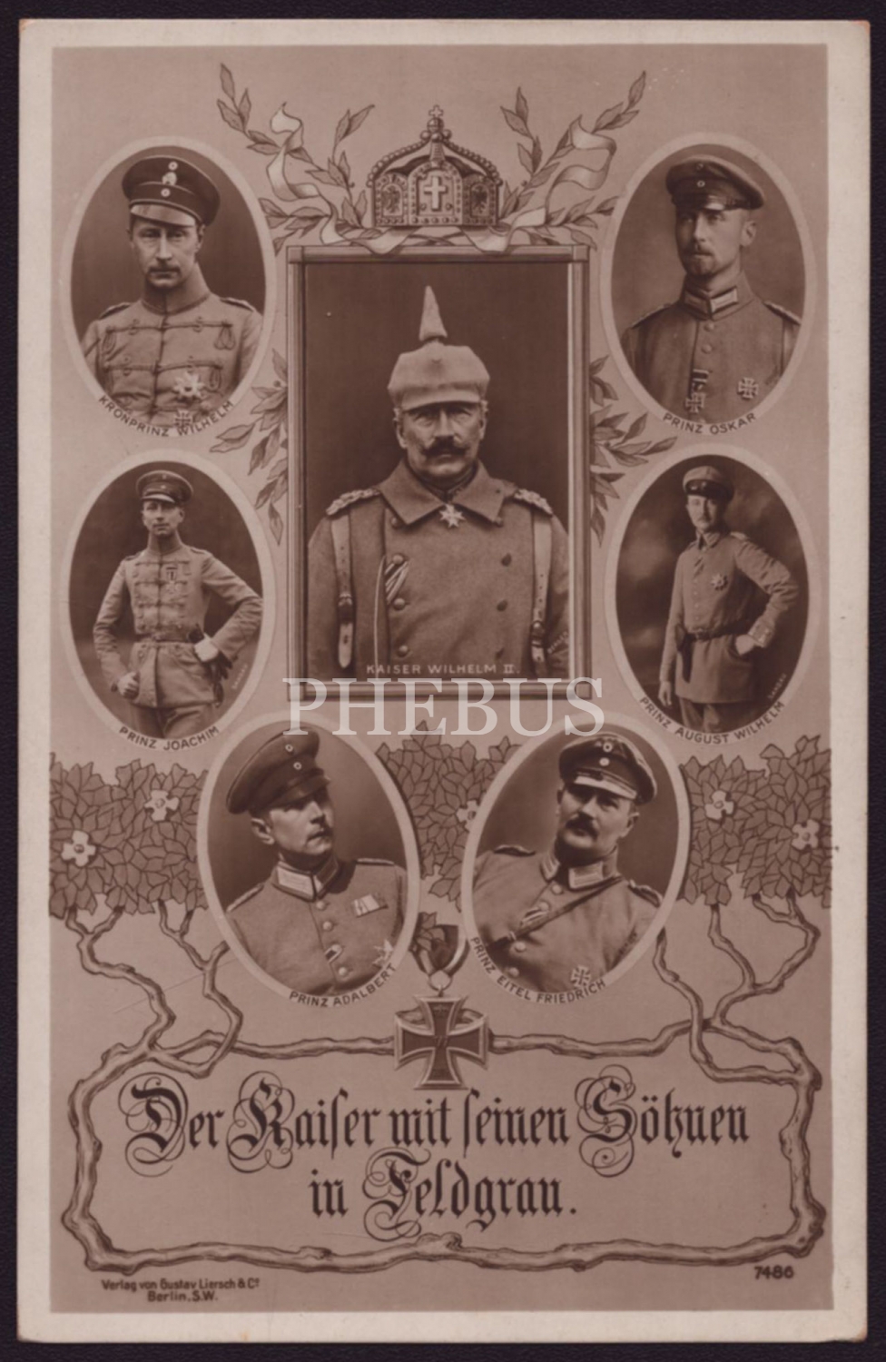 Kaiser II. Wilhelm ve oğullarının portrelerinin yer aldığı Alman baskı kartpostal, "Der kaiser mit seinen Söhnen in Feldgrau", ed.: Gustav Liersch, 14x9 cm...