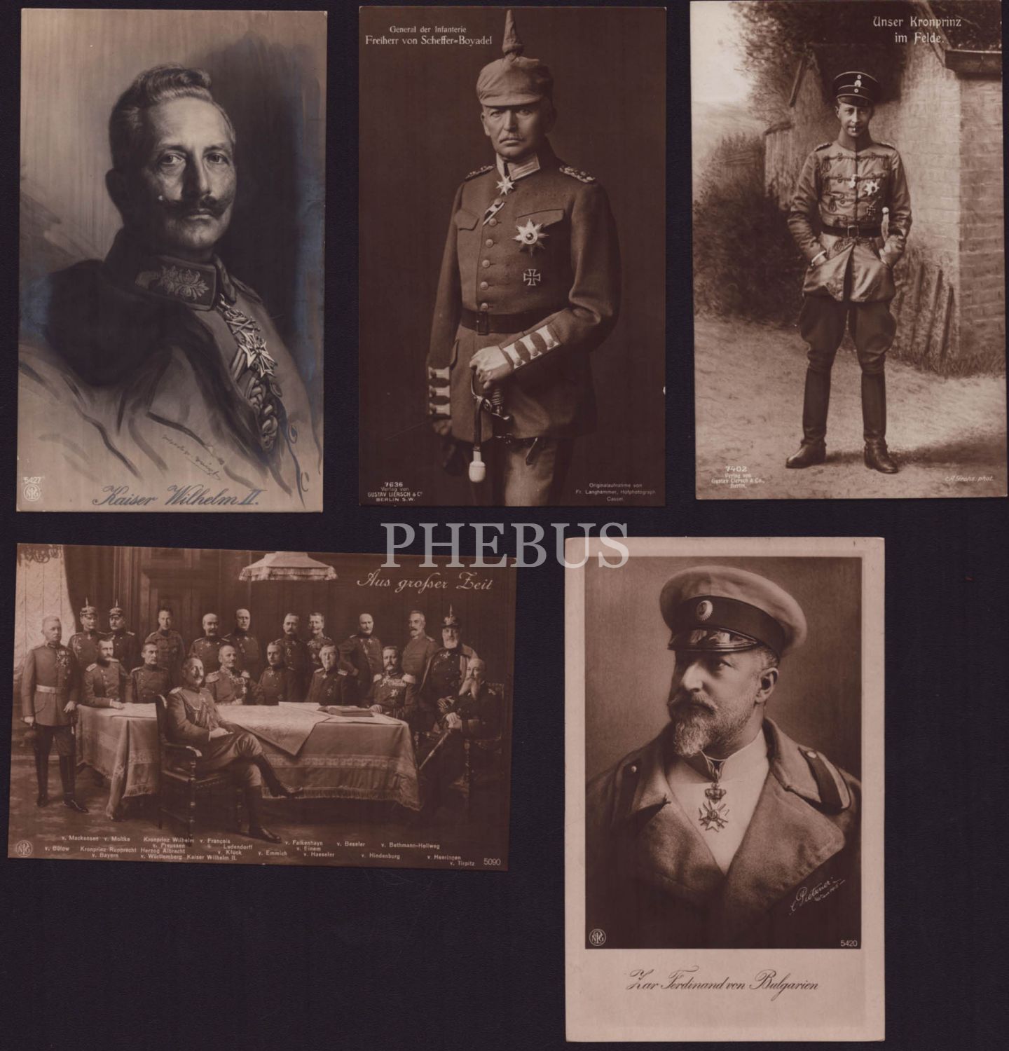 Kasier II. Wilhelm ve Birinci Dünya Savaşı´nın önemli Alman subaylarının fotoğraflarından oluşan 5 adet Alman baskı kartpostal, 14x9 cm...