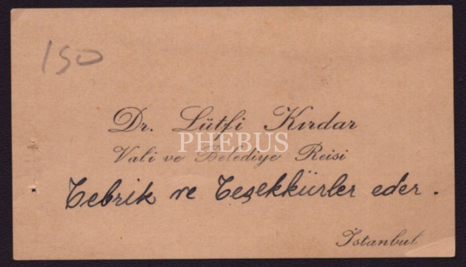 İstanbul Valisi ve Belediye Başkanı Lütfi Kırdar´ın teşekkür ve tebrik yazısının yer aldığı kartviziti, 9x5 cm...