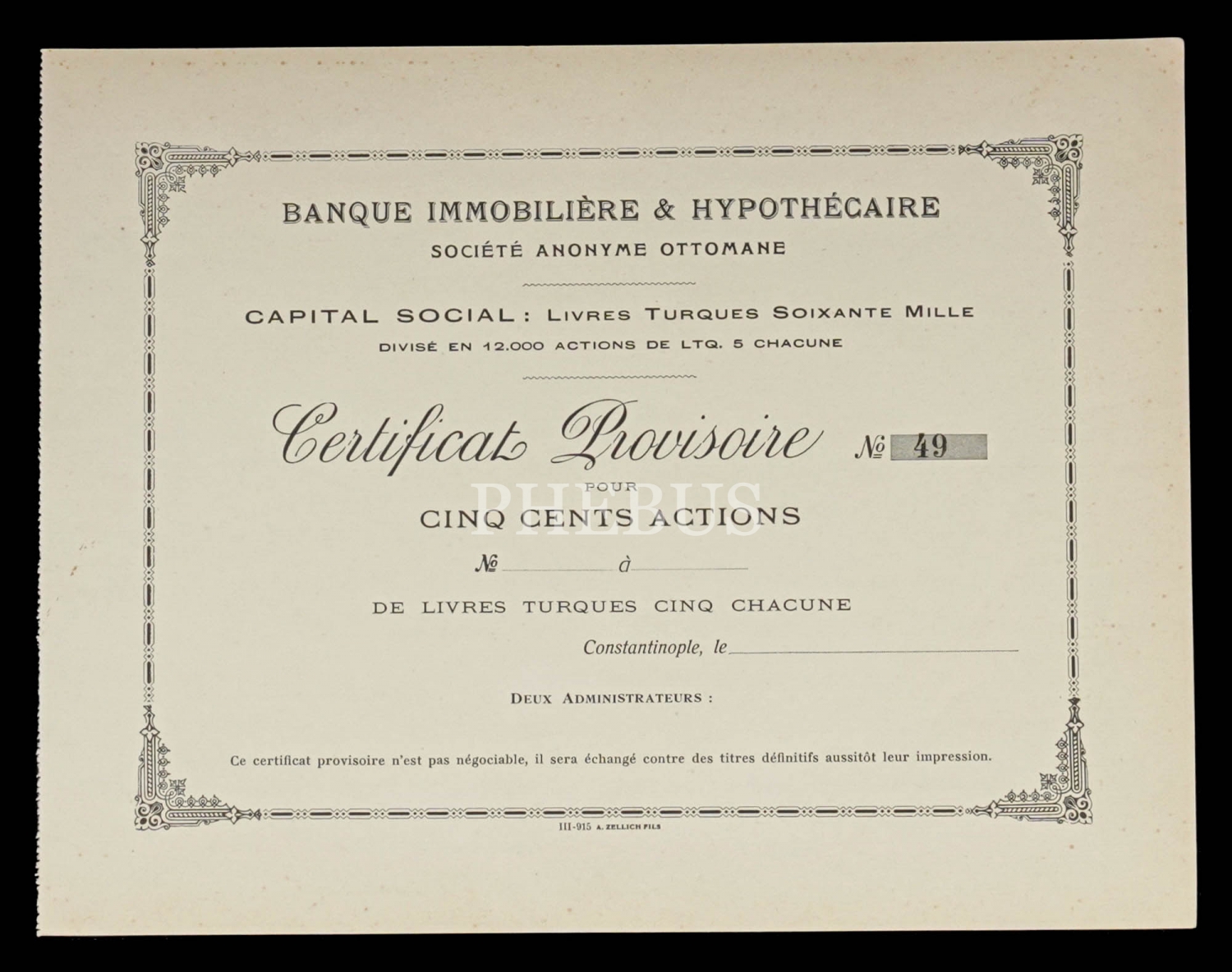 Osmanlı Emlak ve İpotek Bankası, 1915 tarihli muvakkat hisse senedi...