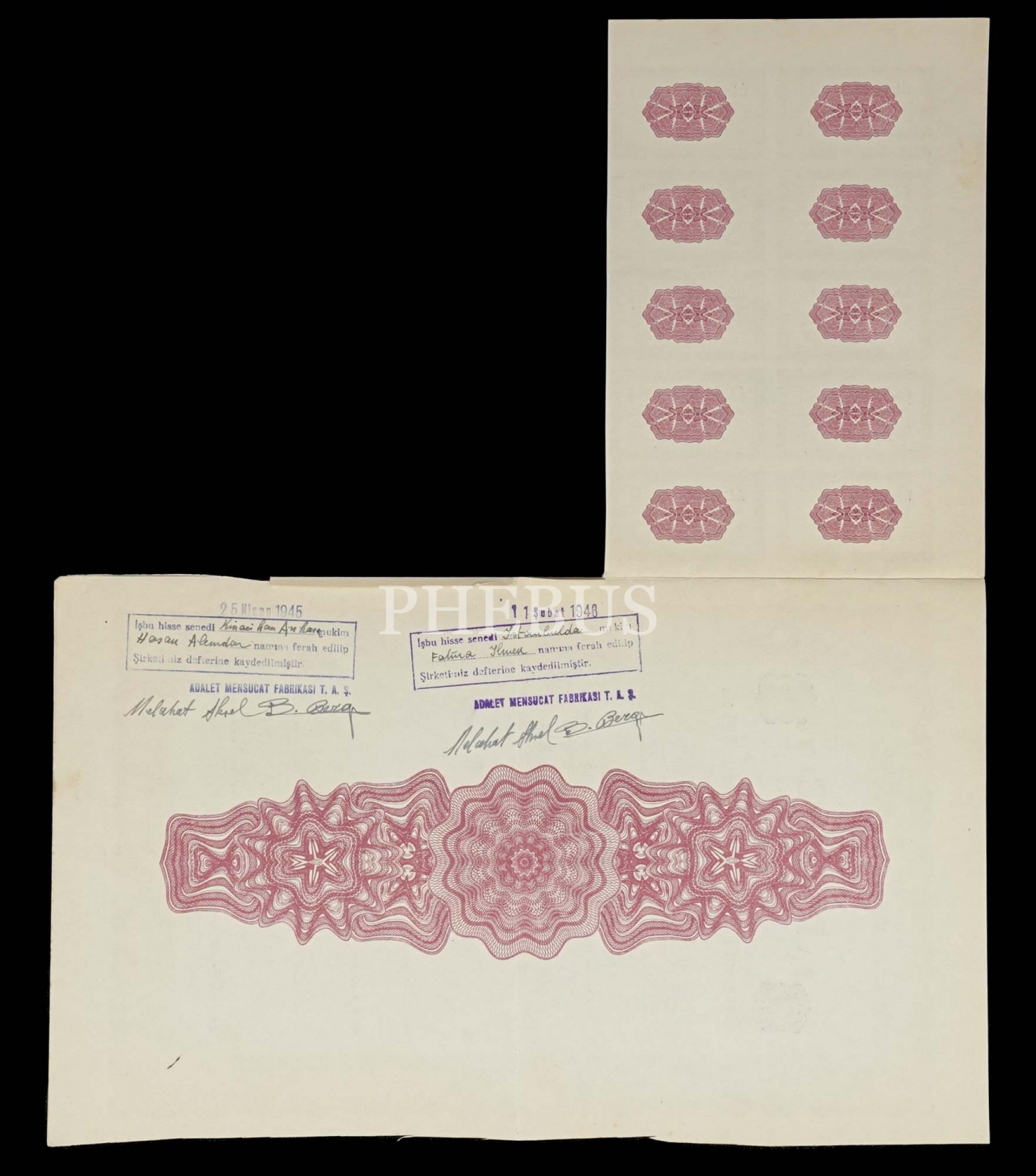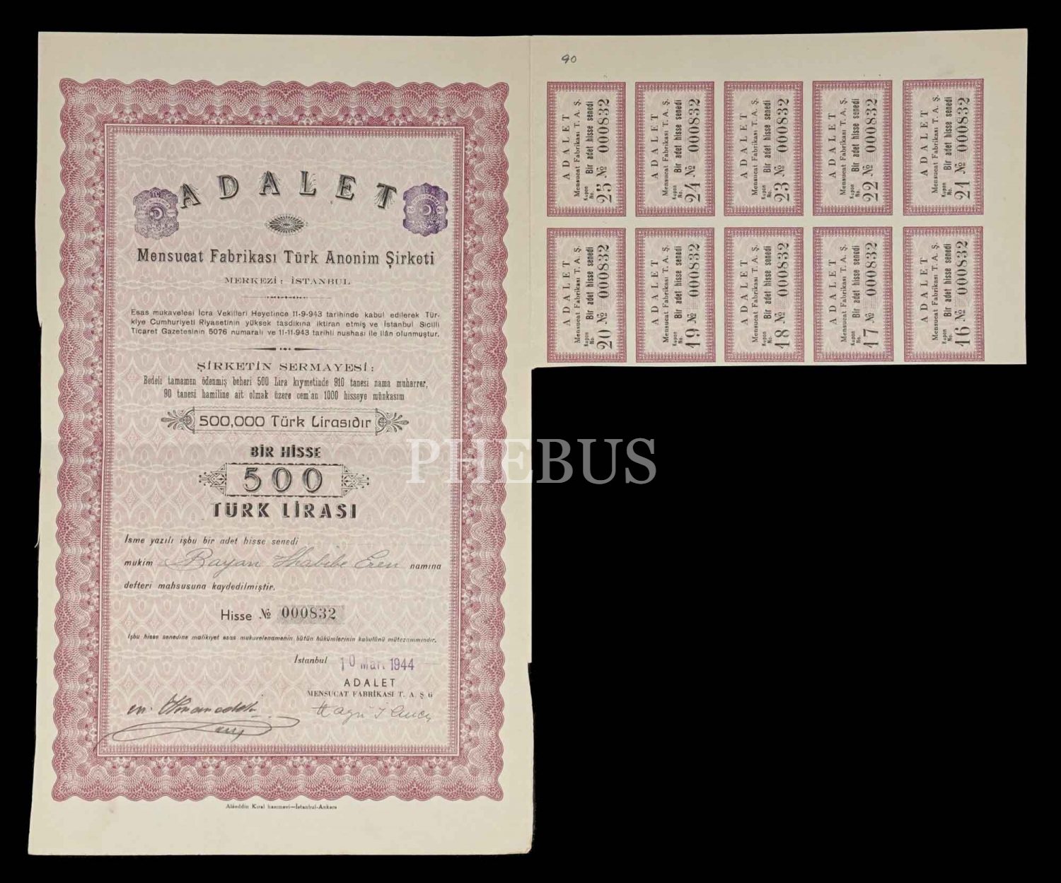 Adalet Mensucat Fabrikaları Anonim Şirketi, 1944 tarihli bir aksiyon hisse senedi...