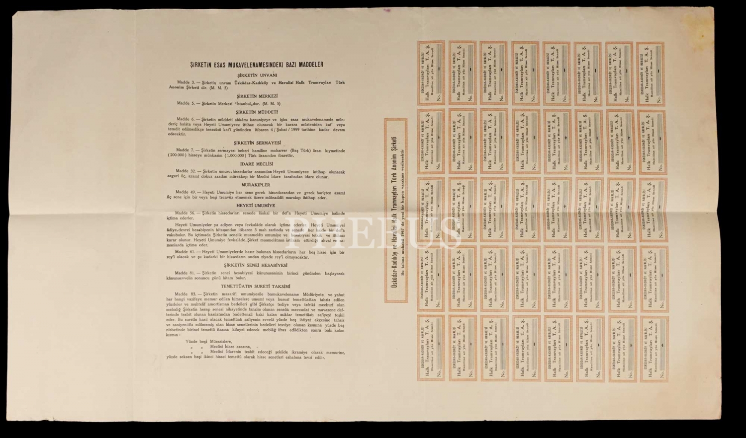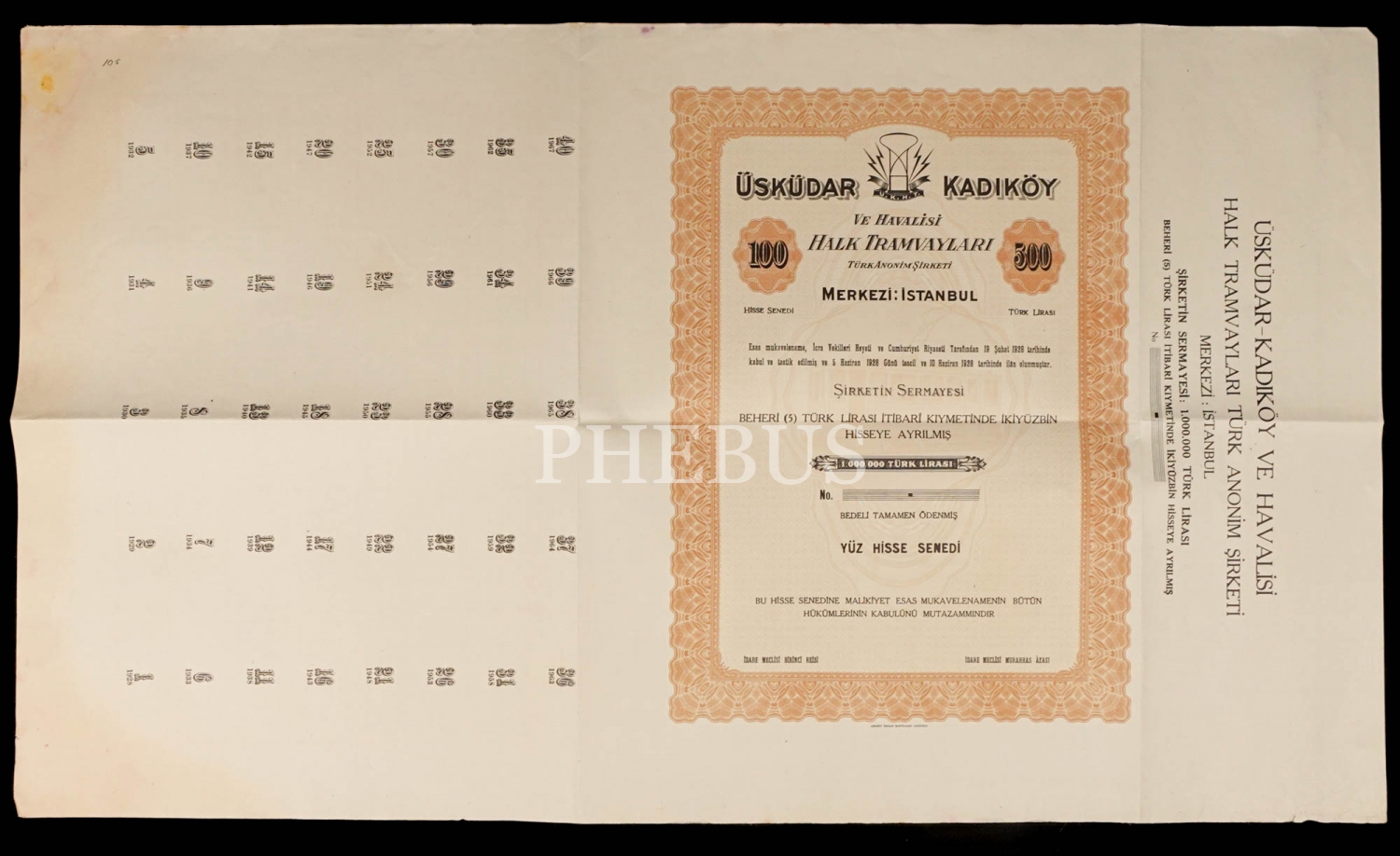 Üsküdar-Kadıköy ve Havalisi Halk Tramvayları Anonim Şirketi, 1937 tarihli yüz aksiyon hisse senedi...