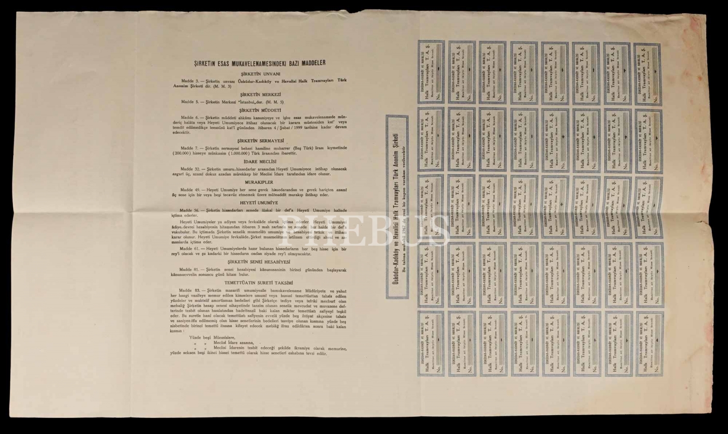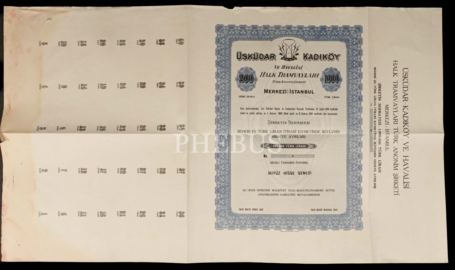 Üsküdar-Kadıköy ve Havalisi Halk Tramvayları Anonim Şirketi, 1937 tarihli İkiyüz aksiyon hisse senedi...