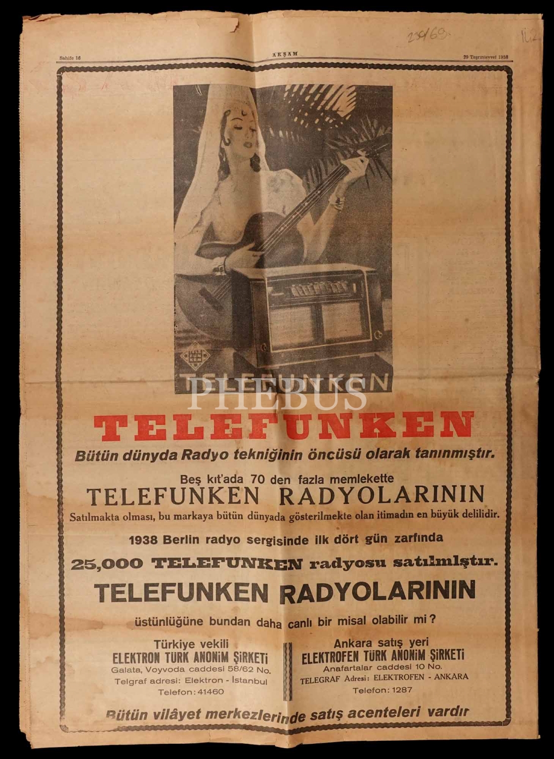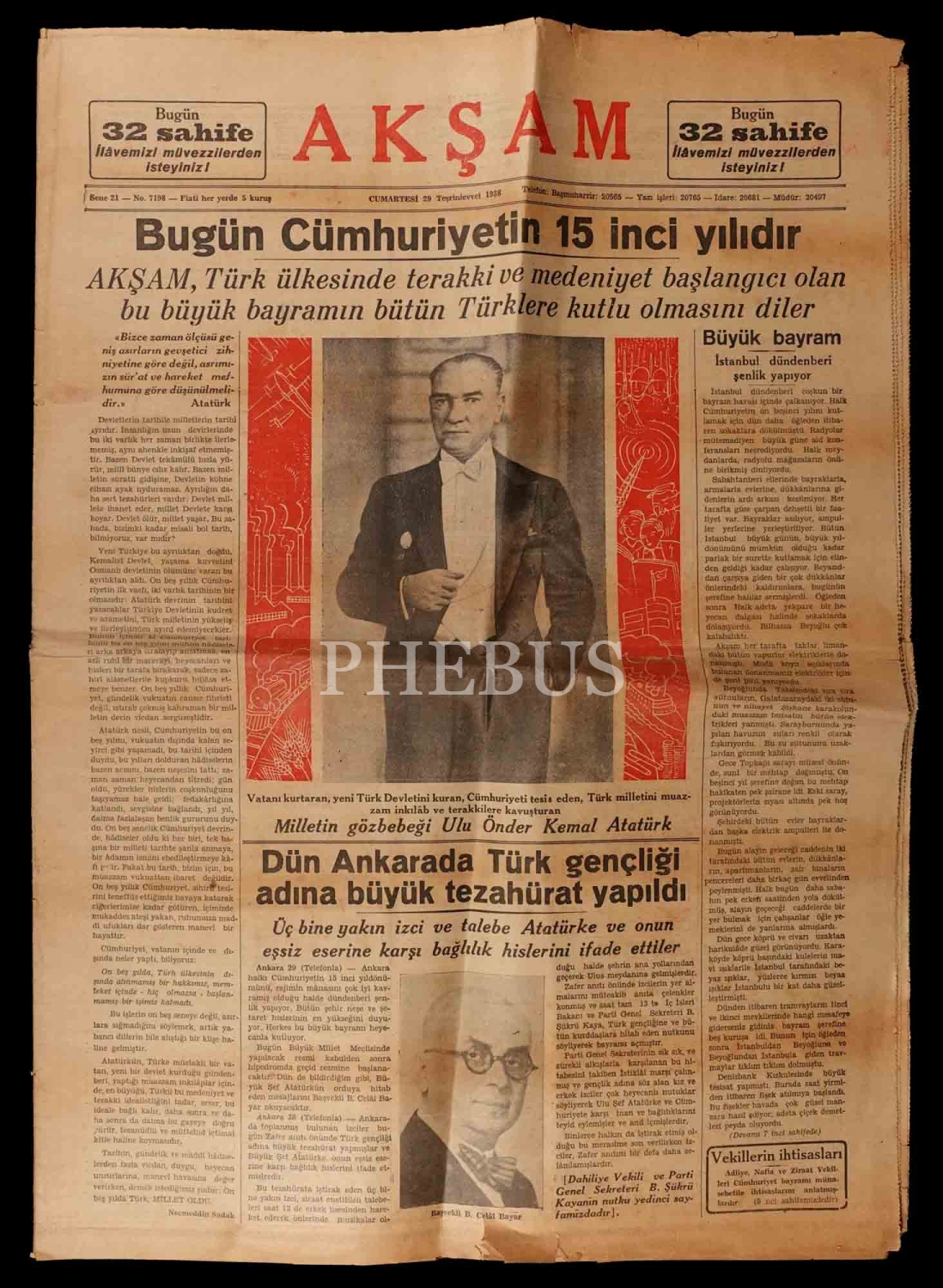 "Bugün Cumhuriyet´in 15 inci Yılıdır" manşetiyle Cumhuriyet'in 15. yılı kutlamalarını konu alan, Mustafa Kemal Atatürk görselli AKŞAM gazetesinin 29 Ekim 1938 tarihli nüshası, 16 sayfa, 41x57...