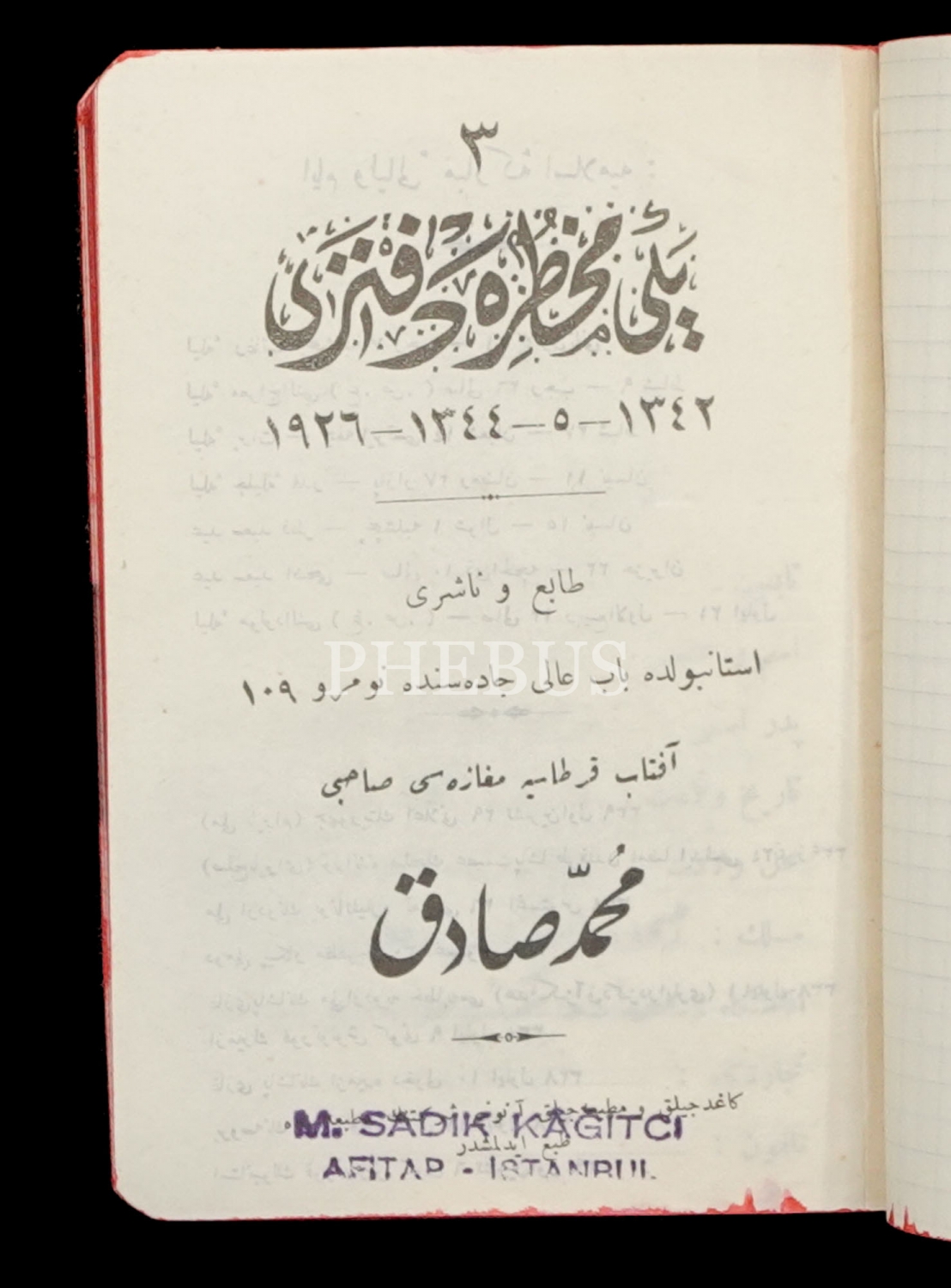 1926 yılı Yeni Muhtıra Defteri, Mehmed Sadık, Kağıtçılık ve Matbaacılık Anonim Şirketi Matbaası, 9x14 cm...