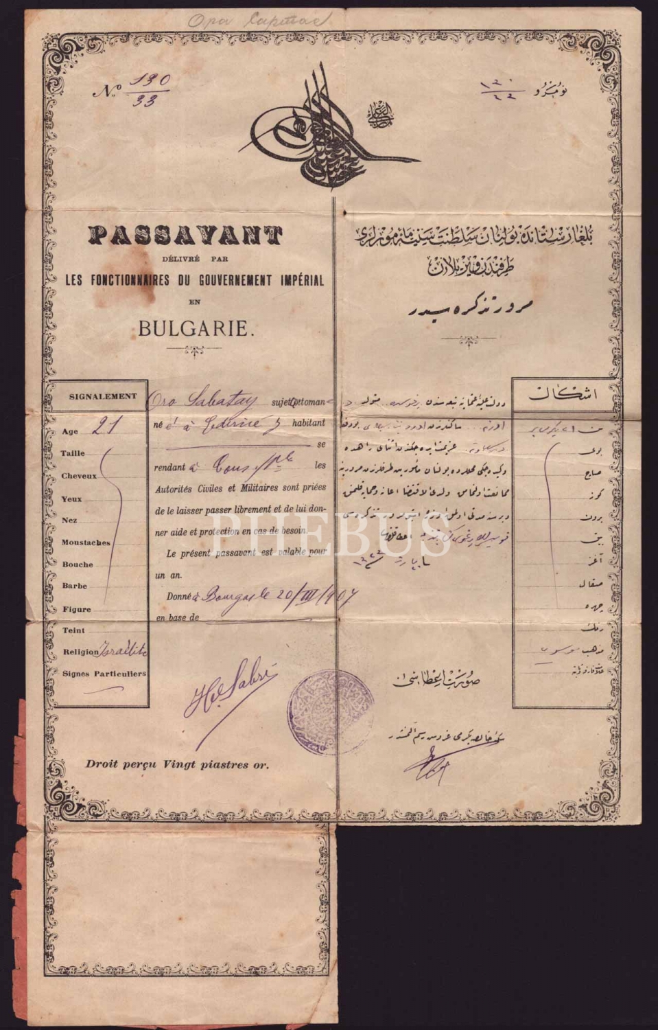 Bulgaristan´dan İstanbul´a seyahat eden memur Oro Sabatay adına düzenlenmiş, Sultan İkinci Abdülhamid tuğralı, 20 Mart 1907 tarihli Fransızca ve Osmanlıca mürur tezkeresi, 26x43 cm...