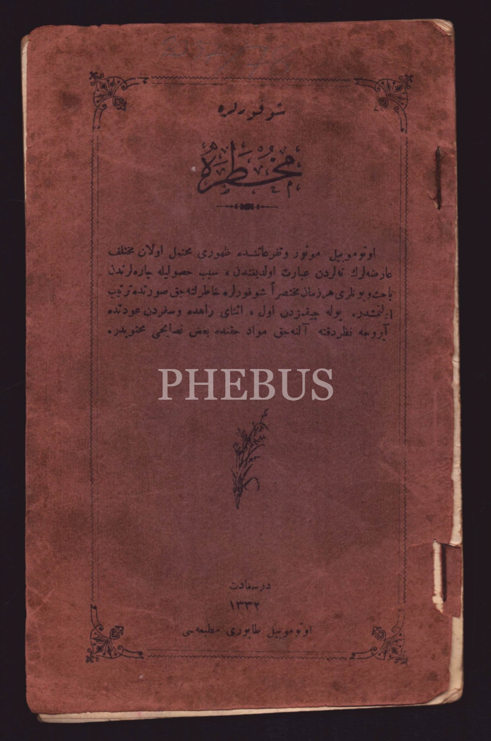 Otomobil Taburu Mektebi´nden mezun olan Davud Oğlu Kohen adına düzenlenmiş askeri şoför diploması, 1332 (1914), Otomobil Taburu Matbaası, 48 sayfa, 12x19 cm...