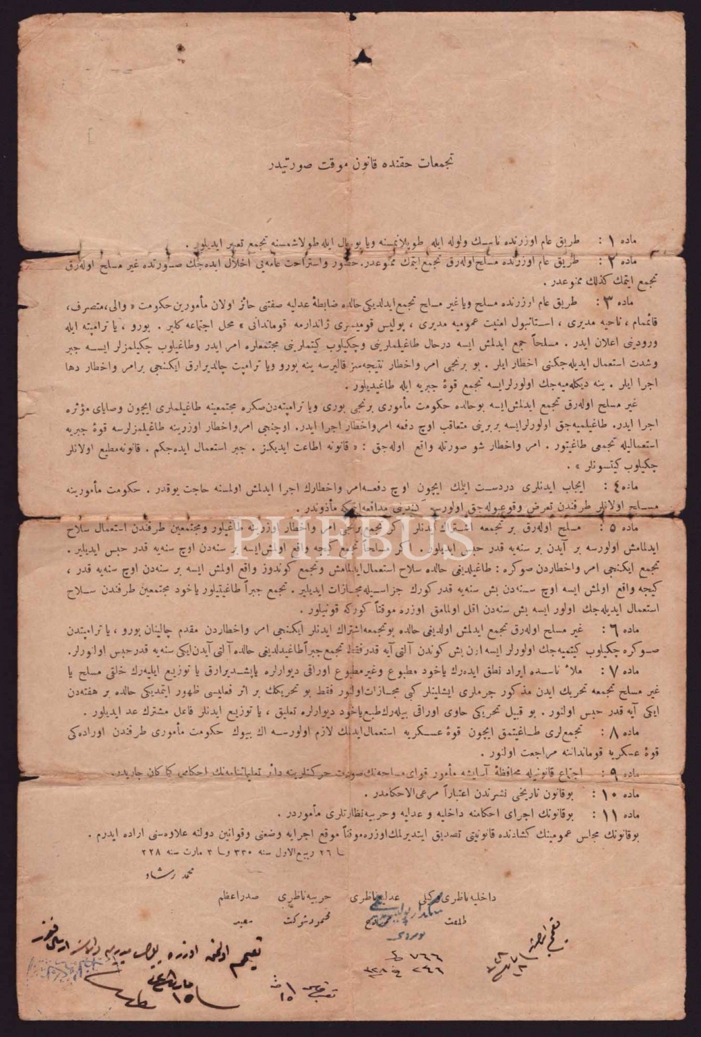 Sultan Mehmed Reşad tarafından 26 Rebiulevvel 1330 tarihinde çıkarılan, kişilerin bir alanda toplanmasının yasak olduğunu, oluşan kalabalığın kolluk kuvvetleri tarafından dağıtılmasını emreden kanunun sureti, 23x34 cm...
