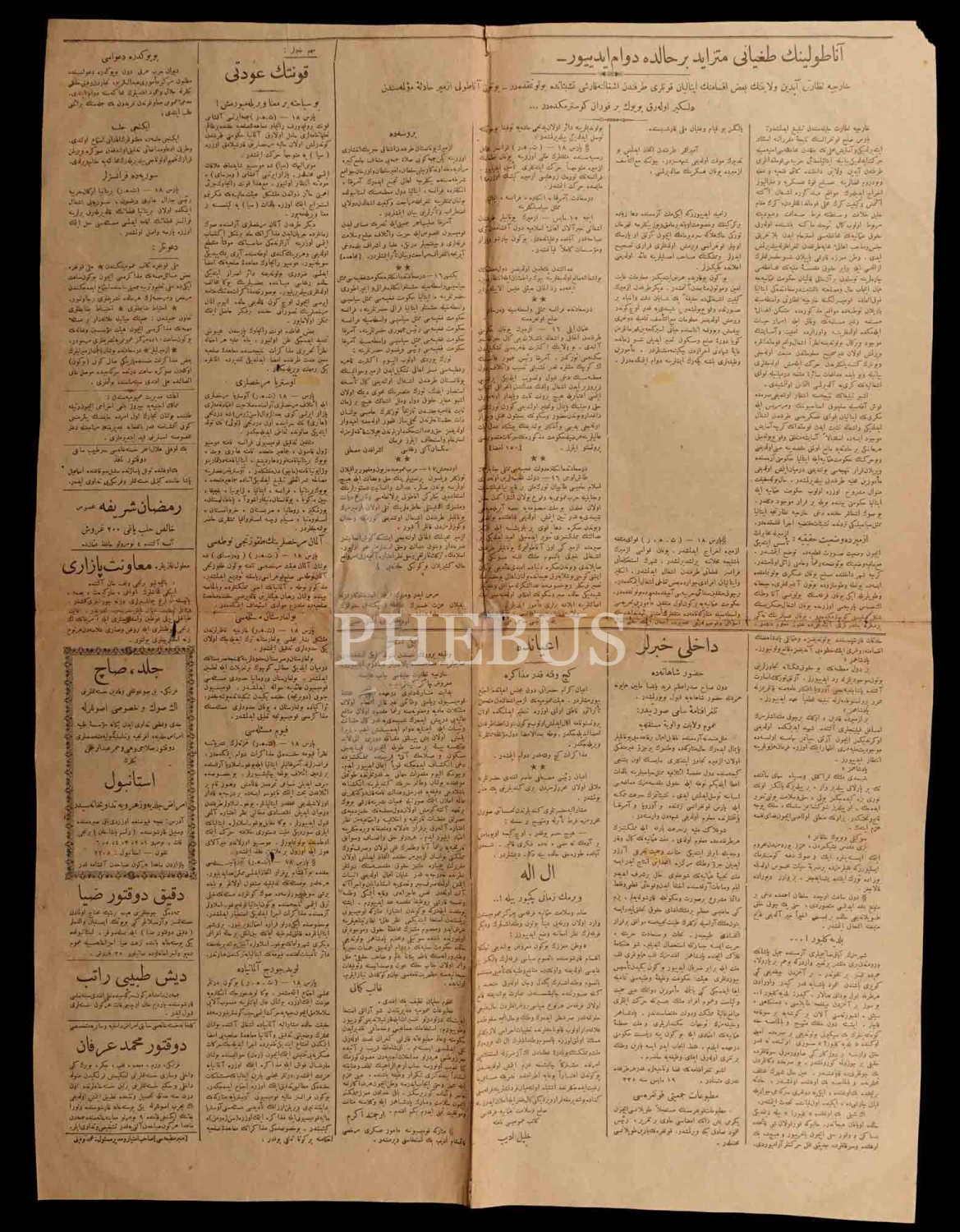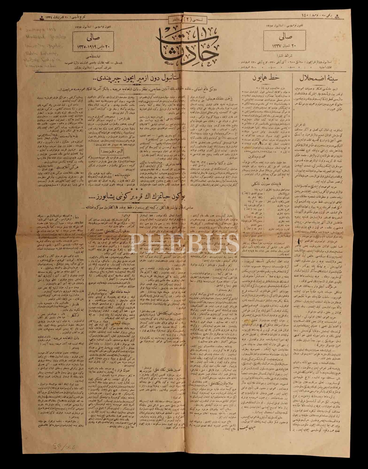 "İstanbul dün İzmir için çırpındı" manşetiyle İzmir´in İşgalini konu alan HADİSAT gazetesinin 20 Mayıs 1919 tarihli nüshası, 2 sayfa, 45x59 cm...