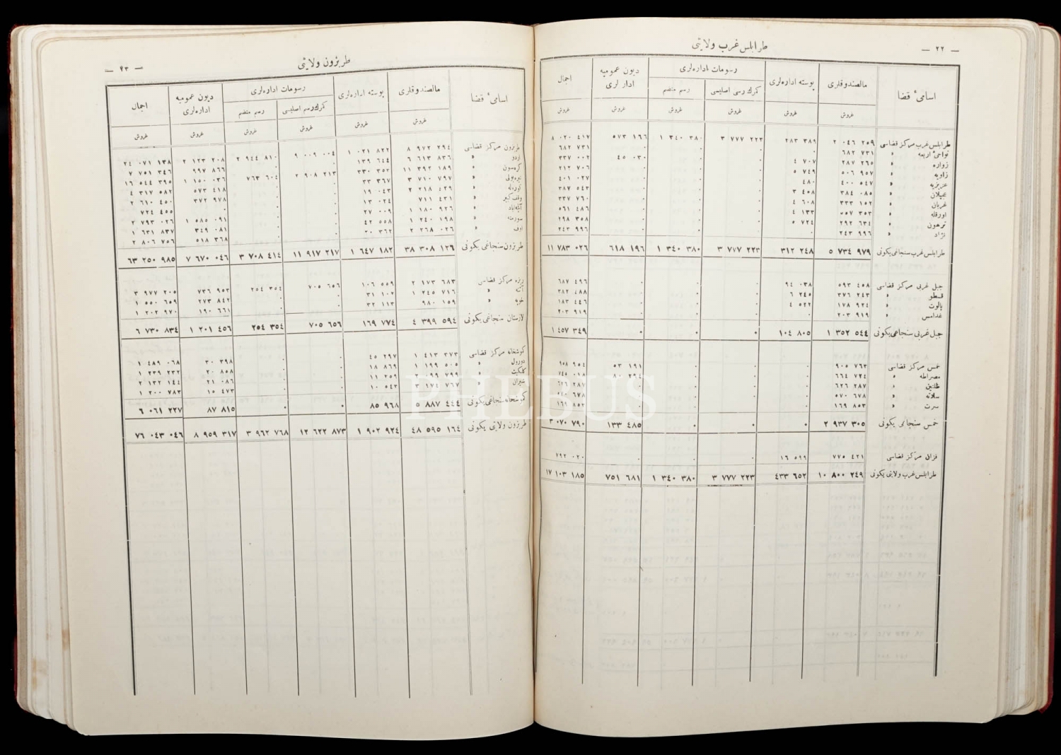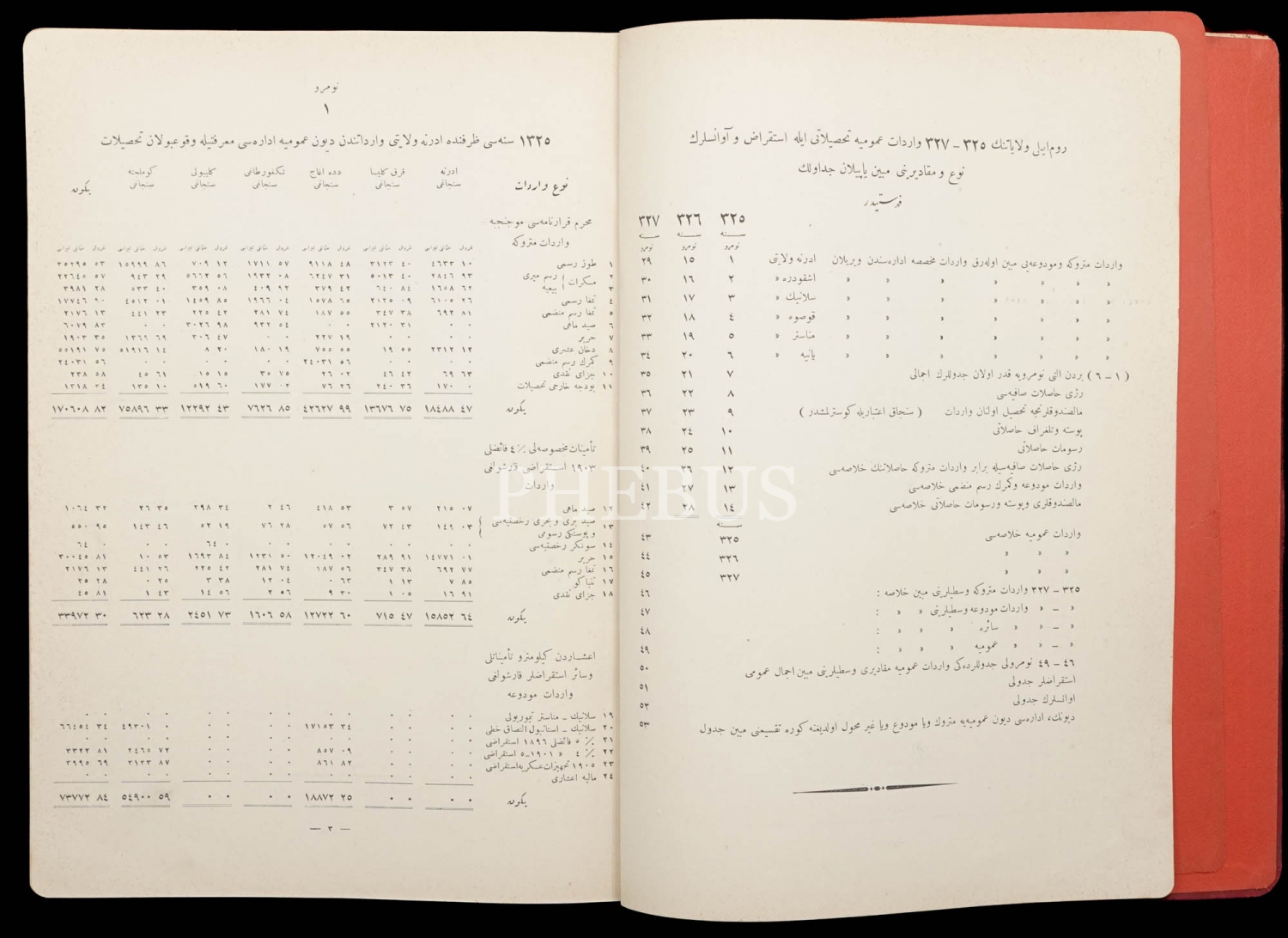 Kitabın ilk bölümü 1325 ile 1327 senesinde Rumeli Vilayeti´nden elde edilen gelirlere ayrılmıştır. İlerleyen bölümler 1325 senesinden başlayarak kronolojik bir sıralama ile 1327 senesine kadar "Tahsilat-ı Umumiye Cetveli" başlığı altında diğer vilayetlerden elde edilen gelirlere ayrılmıştır. Rumeli ve Adalar dâhil salname içeriğine dönük bilgiler de içermektedir.