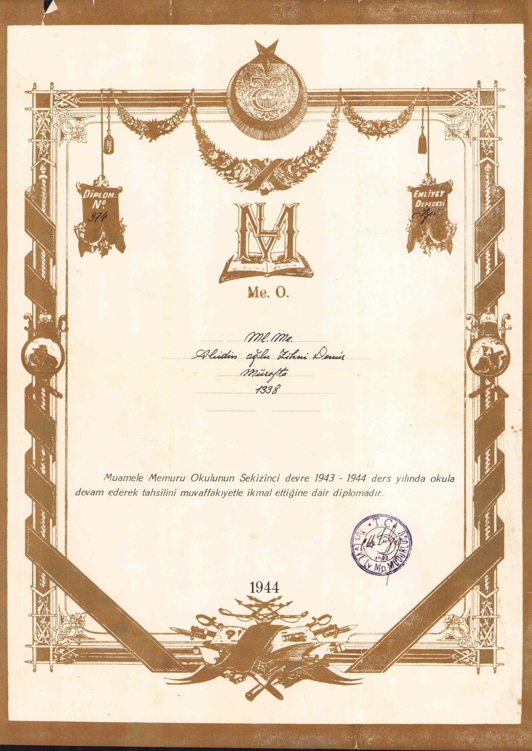 Muamele Memuru Okulu sekizinci devreye ait 1943 - 1944 ders yılına ait diploma, 32x42 cm
