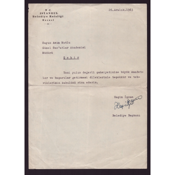 Belediye Başkanı Haşim İşcan Islak İmzalı Mektup