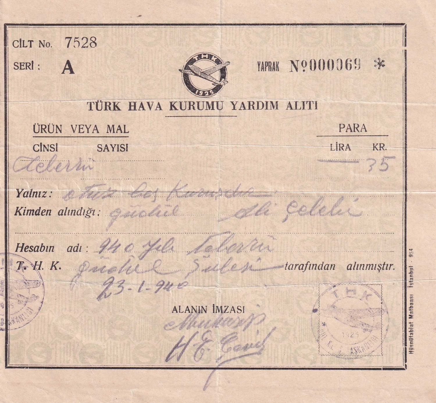 Türk Hava Kurumu yardım alıtı, 1940, 15x16 cm